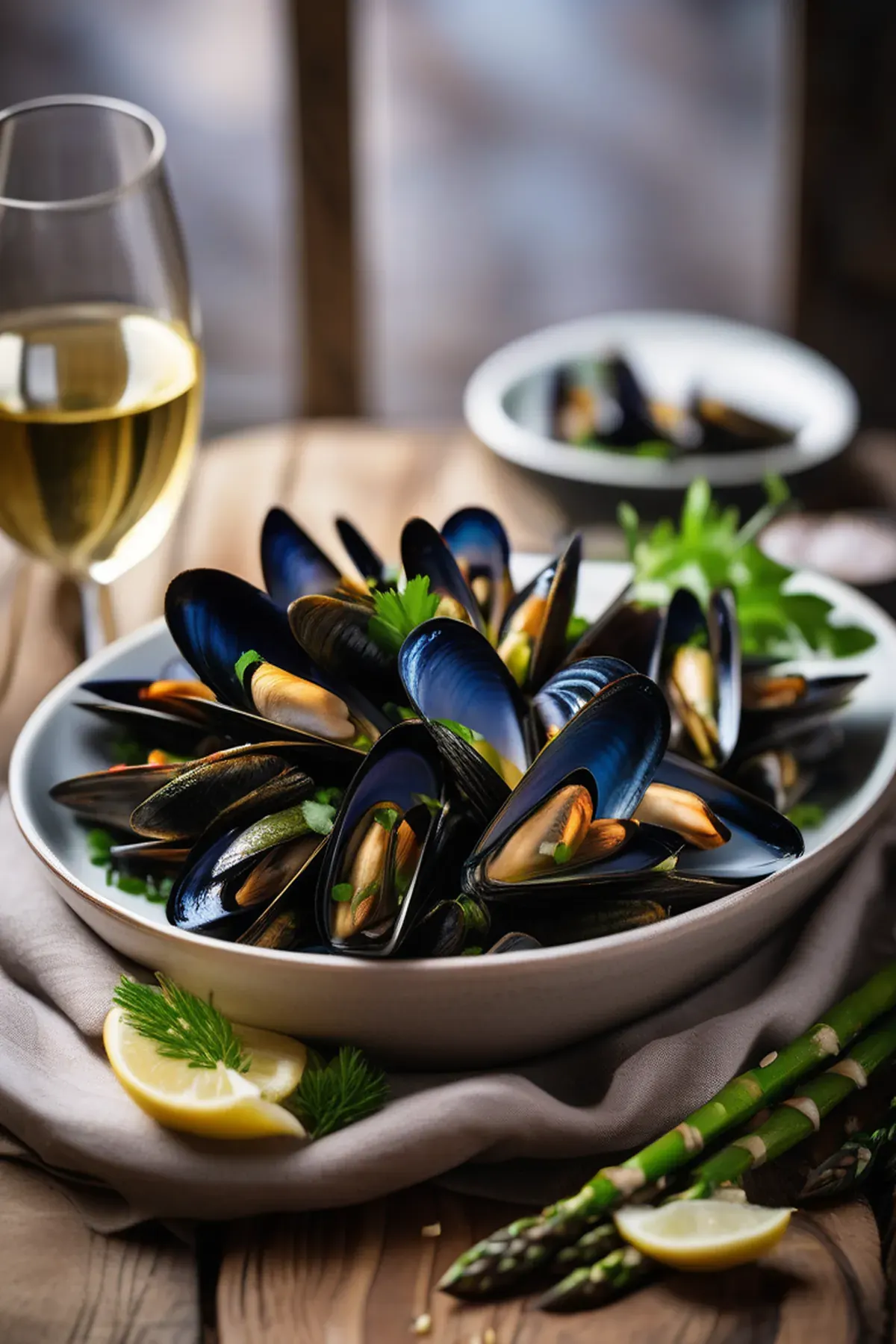 Succulent mussels and tender asparagus spears roasted together in a fragrant white wine and garlic butter sauce, finished with fresh herbs and a squeeze of lemon.