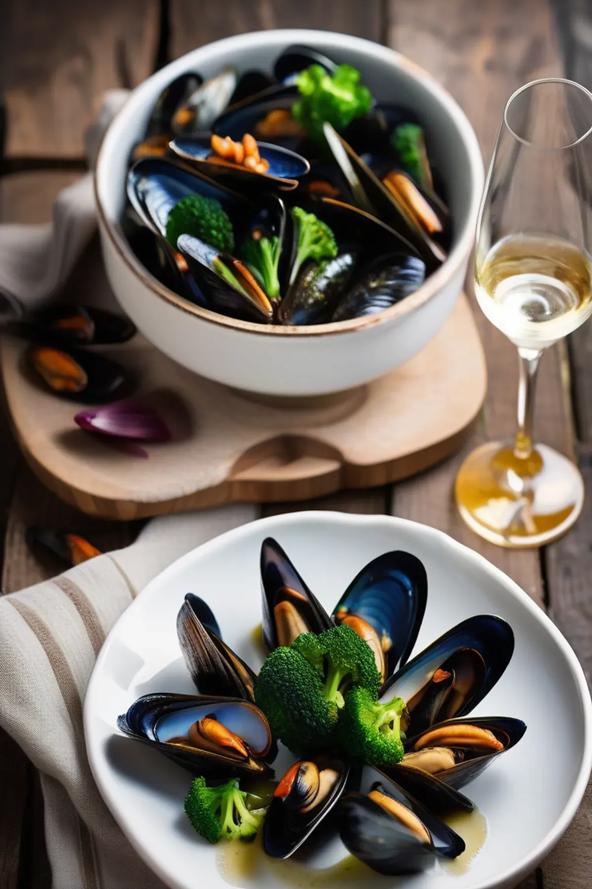 Succulent mussels and tender broccoli florets roasted together with garlic, white wine, and fresh herbs, creating a restaurant-quality seafood dish that's simple yet elegant.