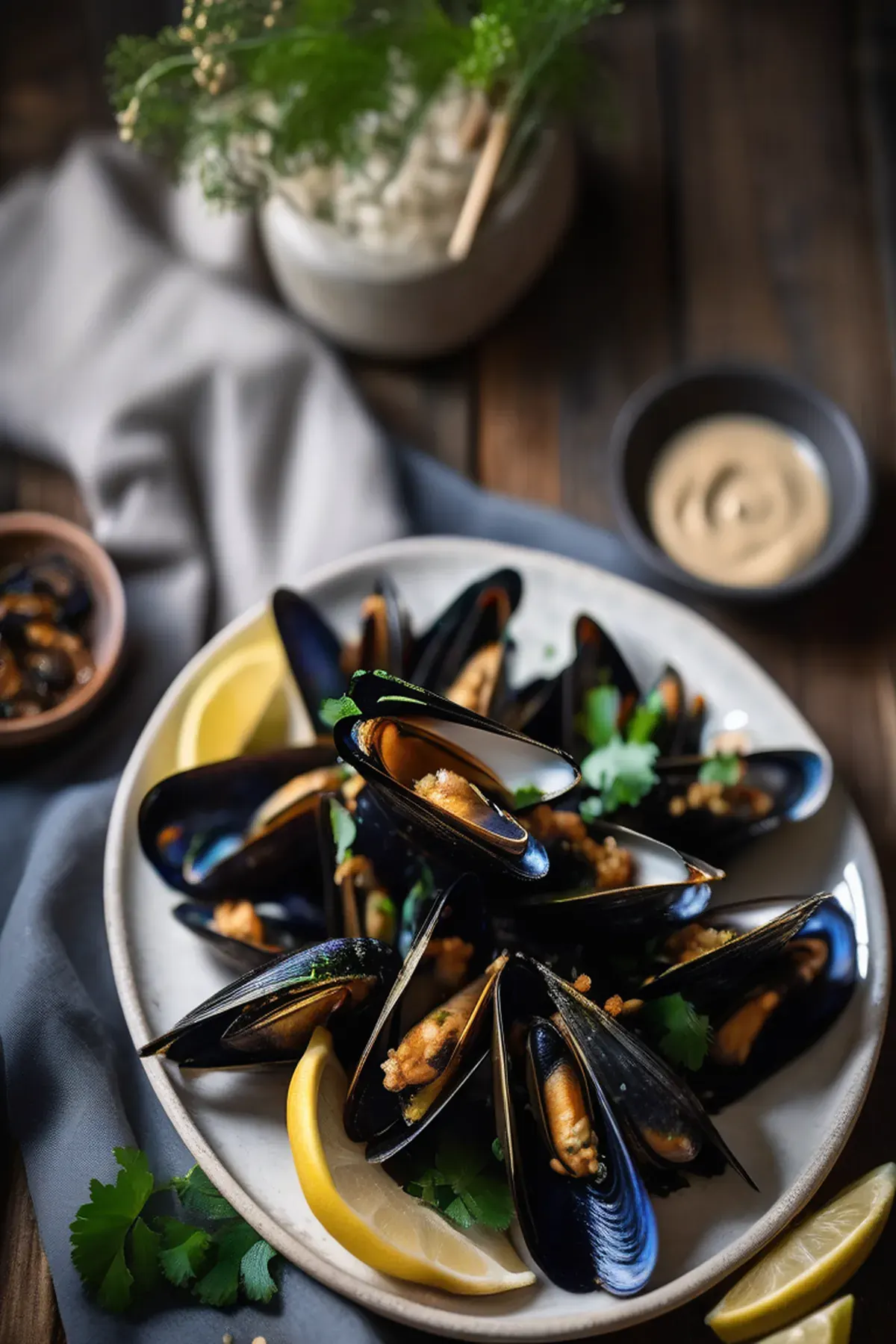Succulent roasted mussels served alongside golden cassava crisps and a silky garlic aioli, creating a delightful contrast of tender seafood and crispy starch with aromatic charm.