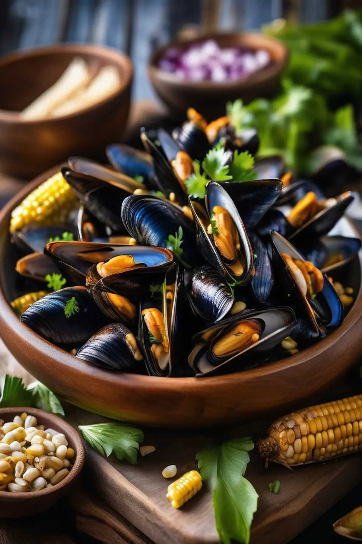 Divide the mussels and corn between serving bowls, pouring the flavorful broth over each portion. Serve immediately with crusty bread for dipping.