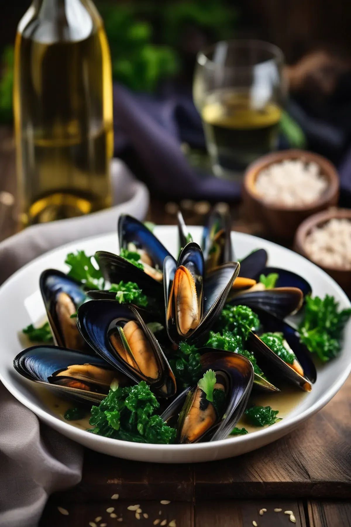 Succulent mussels roasted until they pop open, nestled atop crispy garlic-infused kale with a bright white wine and lemon sauce. A sophisticated yet simple coastal-inspired dish.