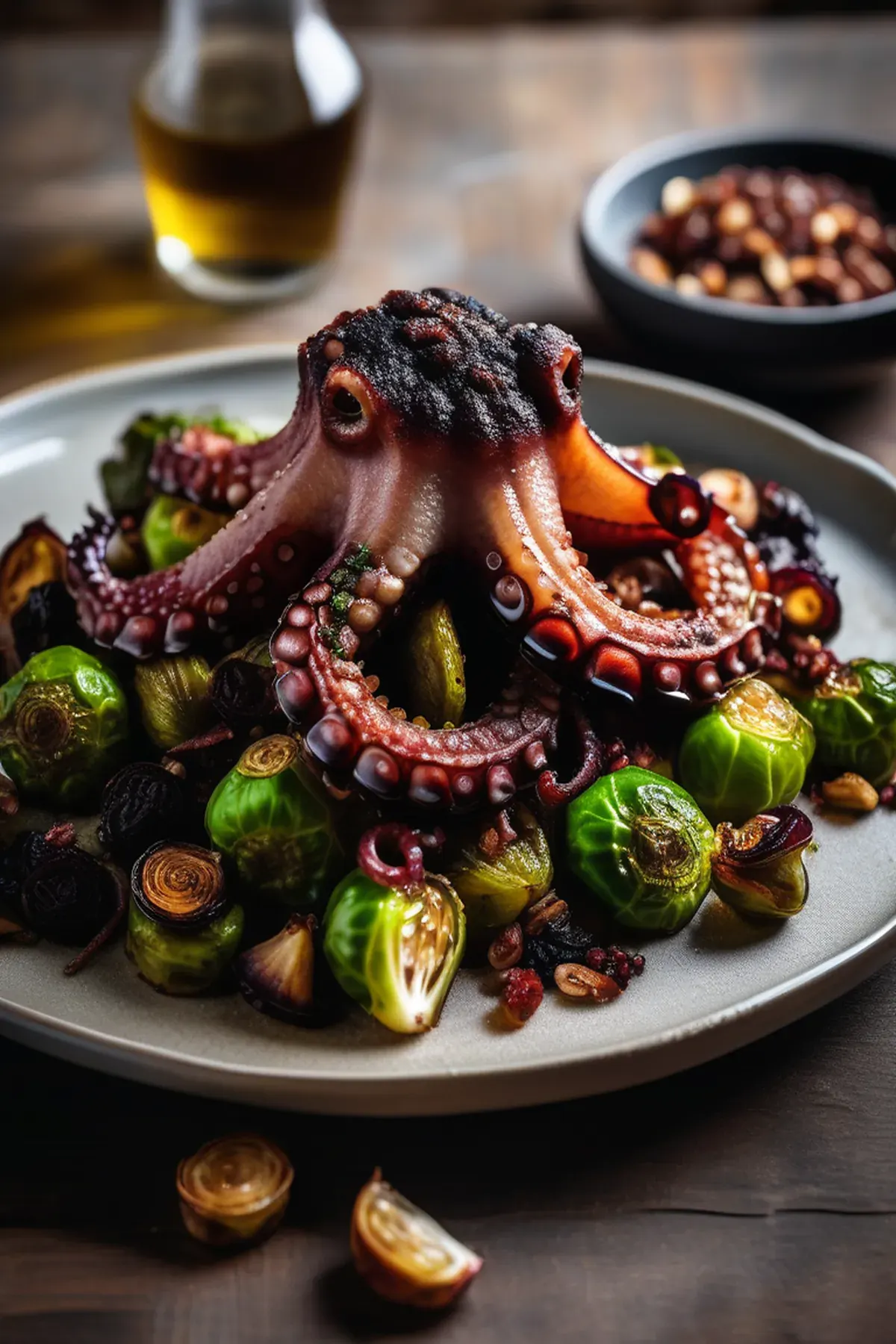 Tender roasted octopus paired with caramelized brussels sprouts, finished with a drizzle of lemon-infused olive oil and crispy garlic chips for a restaurant-quality Mediterranean dish.