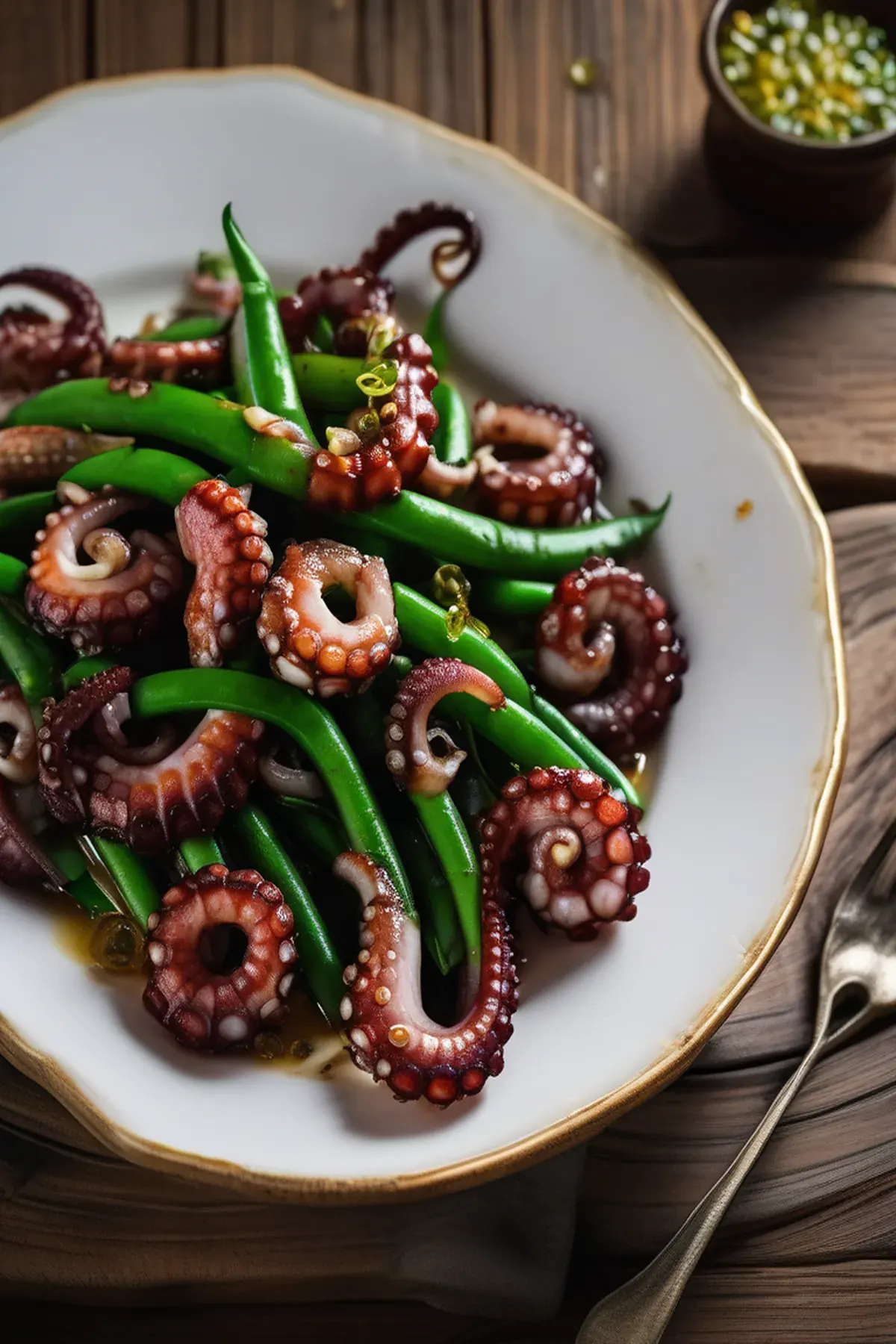 Tender roasted octopus paired with crispy green beans, finished with fragrant garlic-infused olive oil and fresh lemon. A restaurant-quality Mediterranean dish that's surprisingly simple to execute at home.