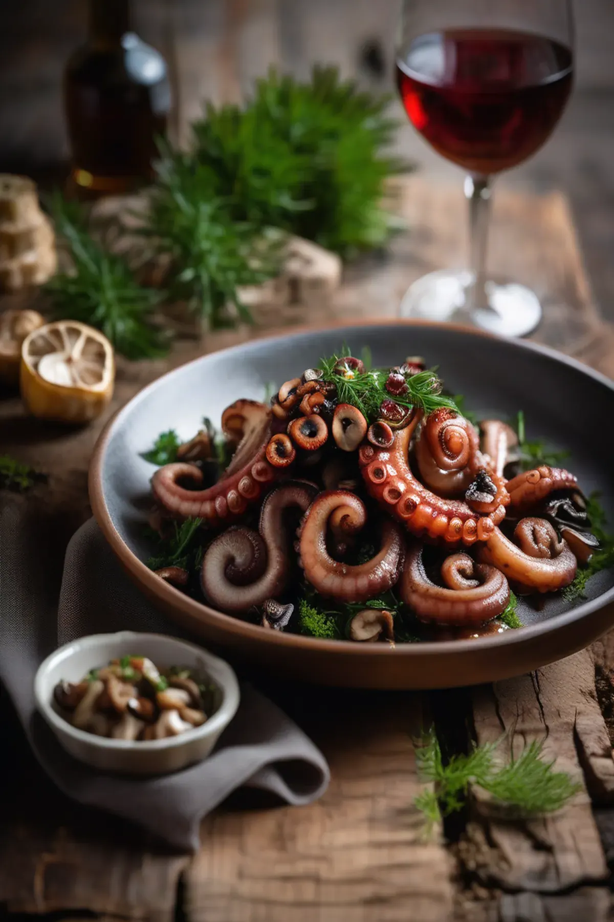 Tender roasted octopus paired with earthy roasted mushrooms and silky garlic confit, finished with a bright lemon and herb oil for an elegant Mediterranean-inspired dish.