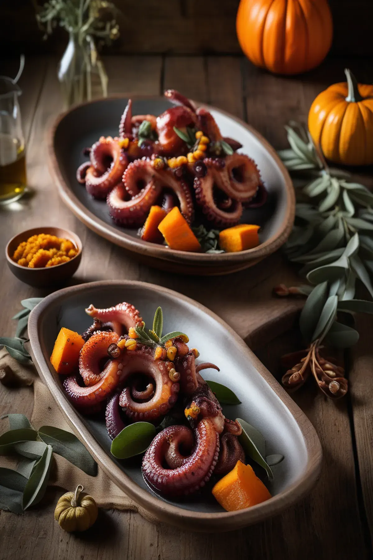 Tender roasted octopus paired with caramelized pumpkin chunks and crispy sage leaves, finished with nutty brown butter and a hint of lemon. A sophisticated yet approachable dish that celebrates autumn flavors.