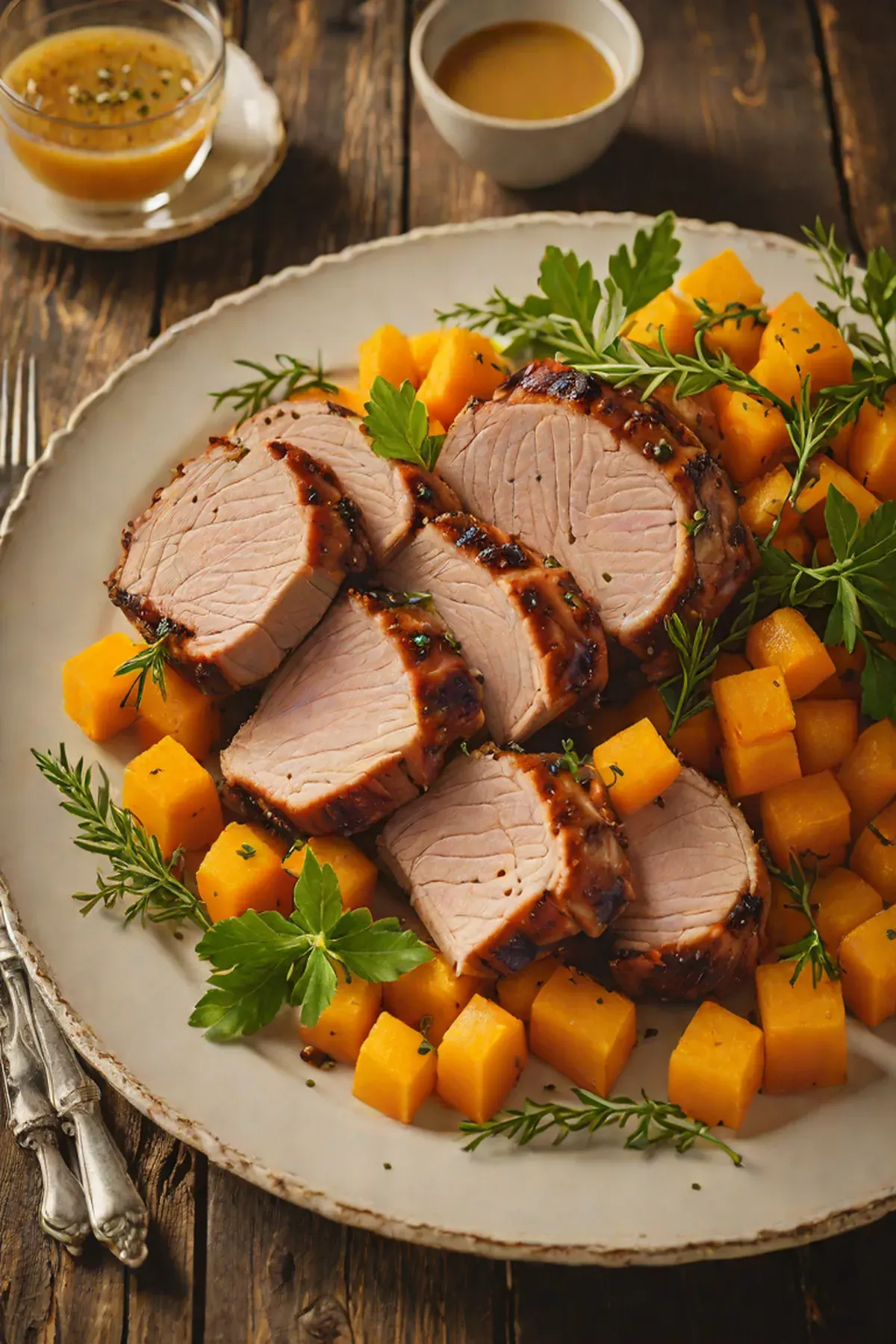 Pour the vegetable broth into the empty skillet (off heat) and scrape up any browned bits with a wooden spoon to create a light pan sauce. Slice the pork and arrange on plates with the roasted squash and onions. Drizzle with the pan sauce before serving.
