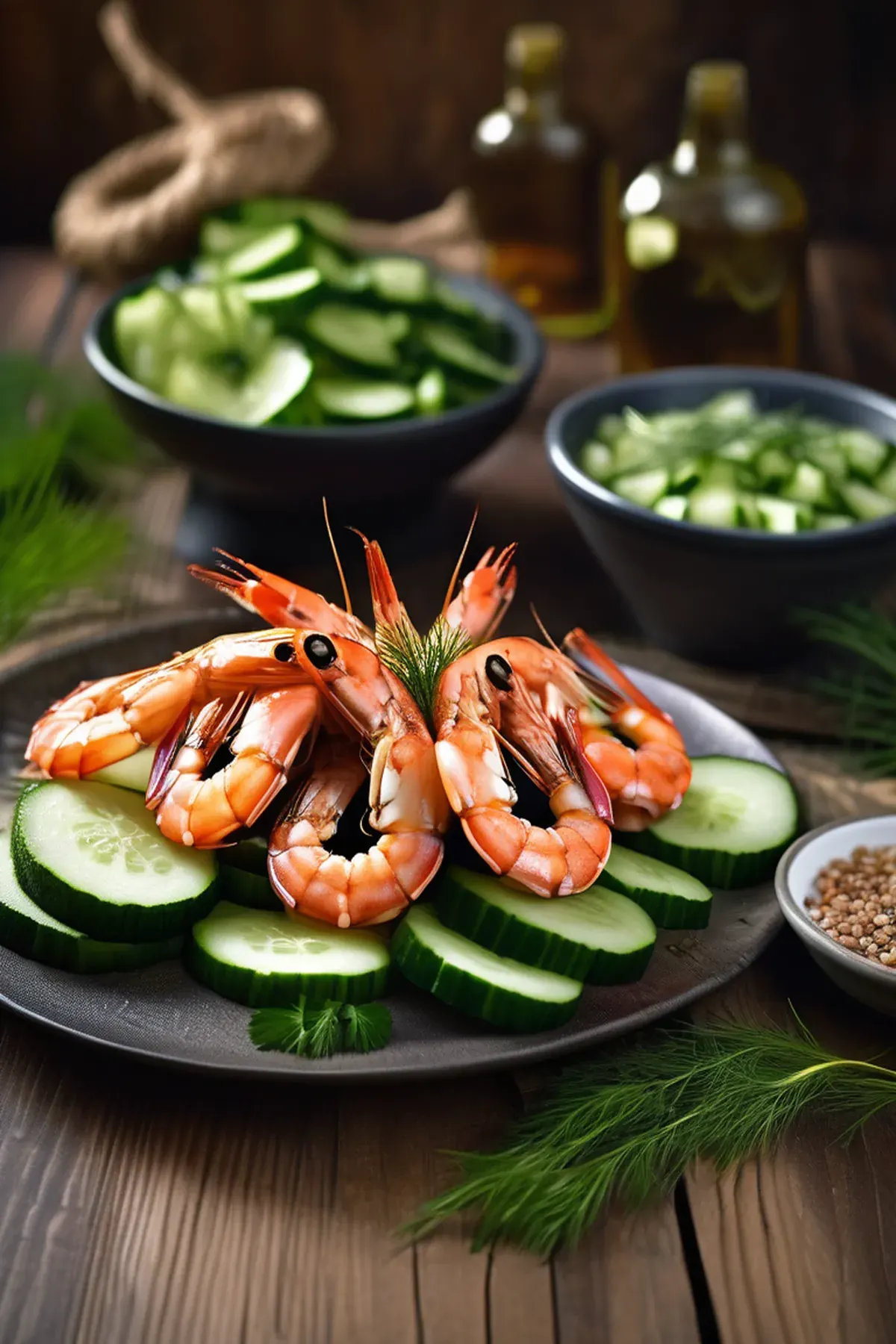 Succulent garlic and herb-roasted prawns paired with crisp cucumber ribbons, finished with a bright lemon-dill dressing for a light yet satisfying dish.