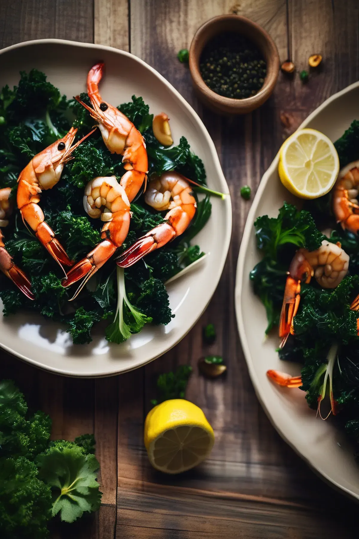 Succulent garlic-infused prawns paired with crispy roasted kale chips and a hint of lemon, creating a light yet satisfying seafood dish bursting with Mediterranean flavors.
