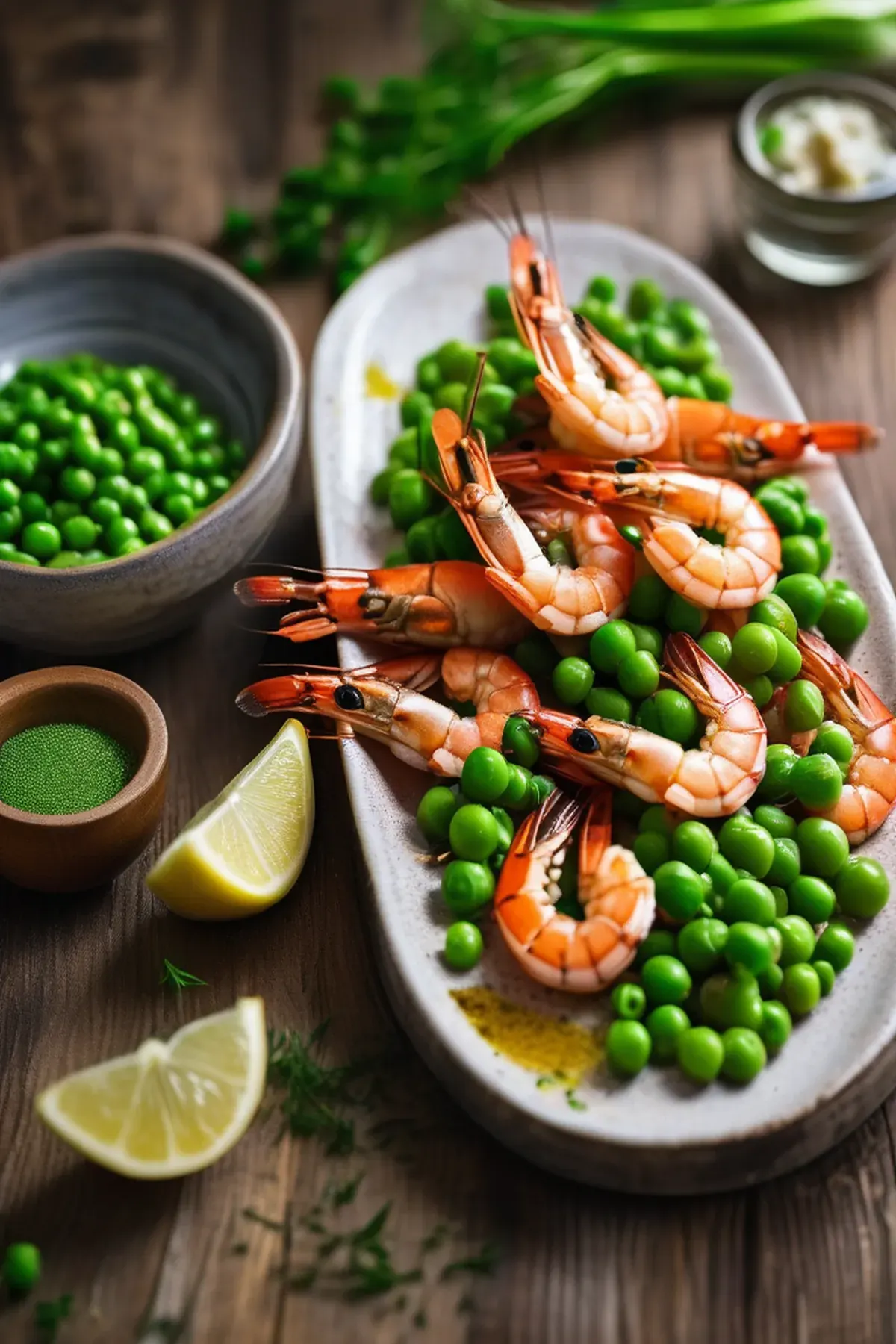 Succulent jumbo prawns tossed with fresh sweet peas, roasted until golden and finished with a fragrant garlic butter sauce that's perfect served over crusty bread.
