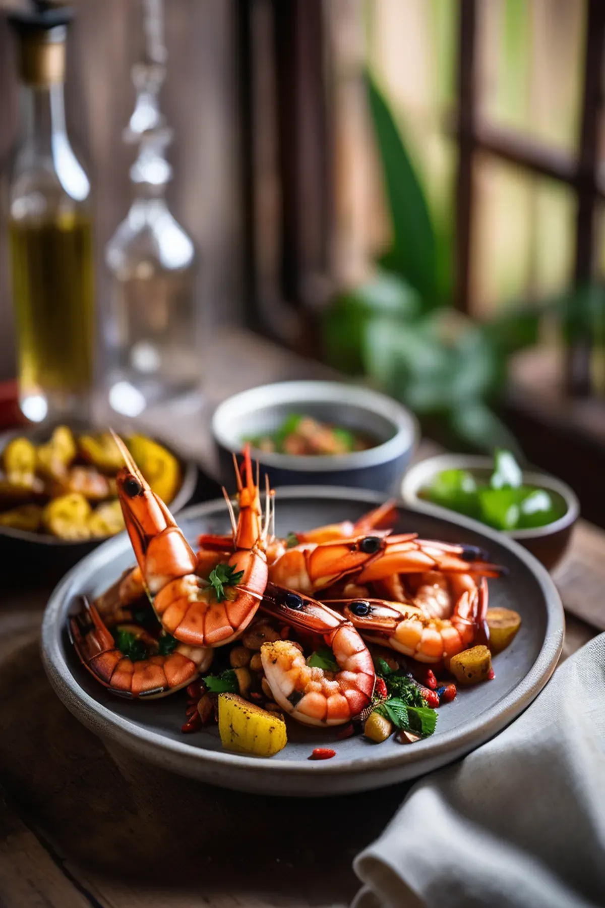 Succulent garlic and chili-infused prawns paired with golden caramelized plantain slices, creating a stunning seafood dish with tropical sweetness and savory depth.