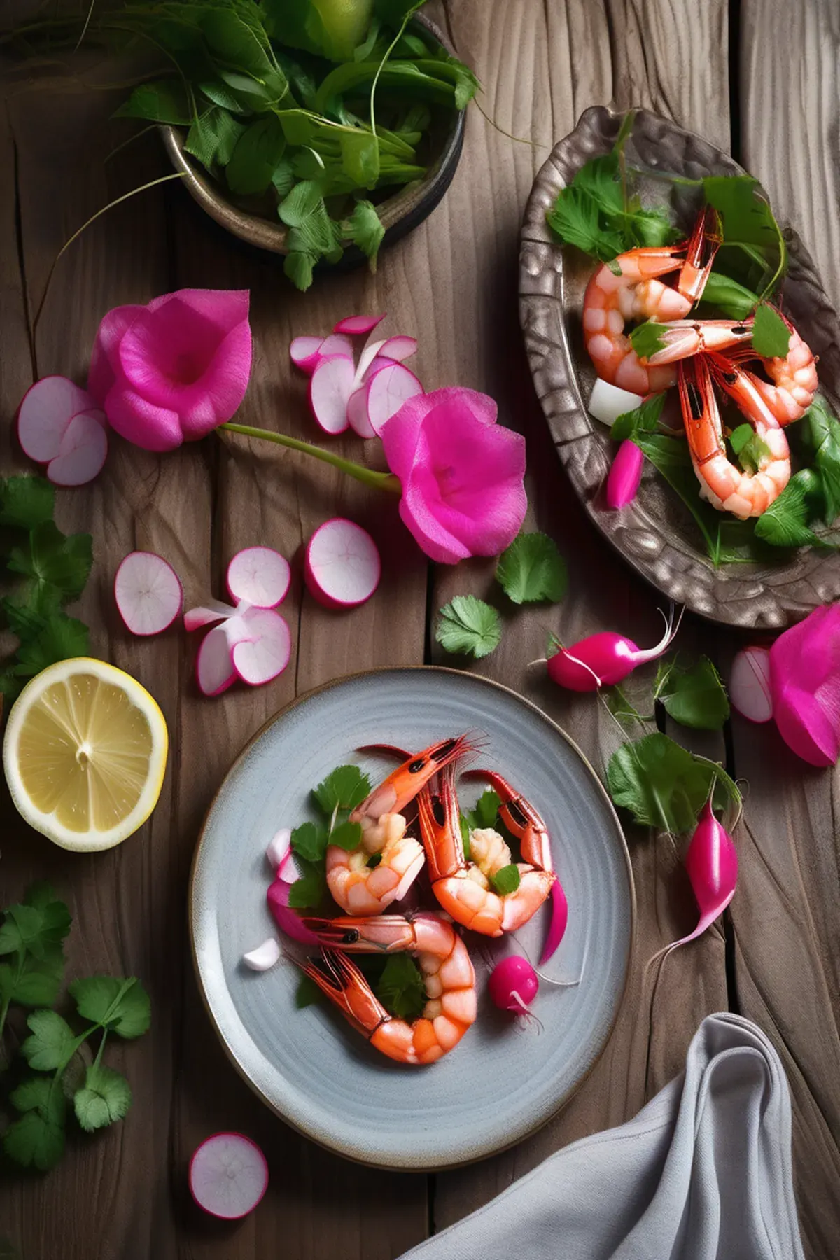 Succulent garlic-butter roasted prawns paired with crispy roasted radishes and a bright lemon-herb glaze, creating a light yet satisfying dish with delicate flavors and beautiful presentation.