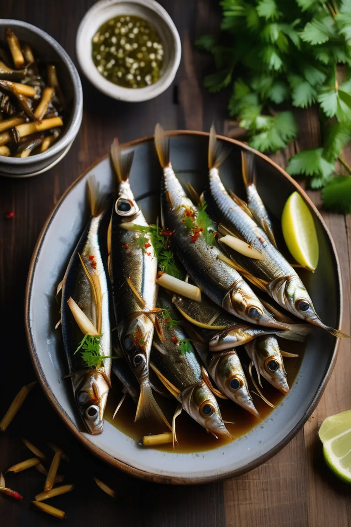 Crispy pan-roasted sardines paired with tender bamboo shoots in a fragrant garlic and ginger sauce, finished with a touch of sesame oil for a sophisticated yet simple Asian-inspired dish.
