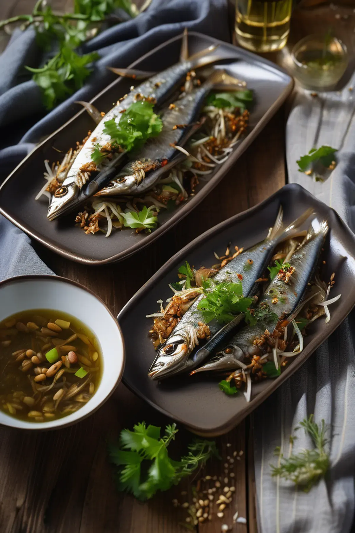 Whole sardines roasted until golden and flaky, served atop a vibrant warm bean sprout salad with a drizzle of infused garlic oil and fresh herbs. A simple yet elegant dish that celebrates the delicate flavors of the sea.