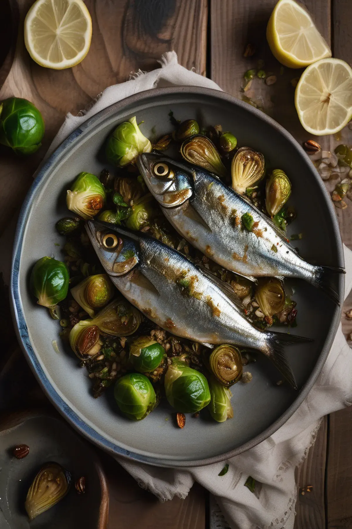 Golden-roasted sardines paired with caramelized Brussels sprouts, finished with crispy garlic chips and a bright lemon-herb drizzle for a simple yet elegant Mediterranean-inspired dish.