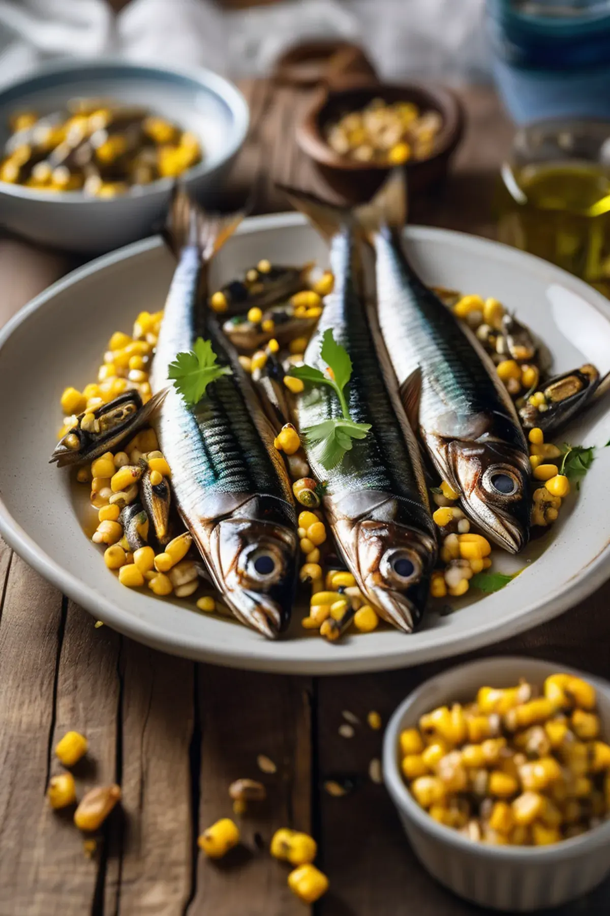 Crispy Mediterranean roasted sardines paired with charred sweet corn, finished with a bright lemon-herb drizzle for a simple yet elegant seafood dish.