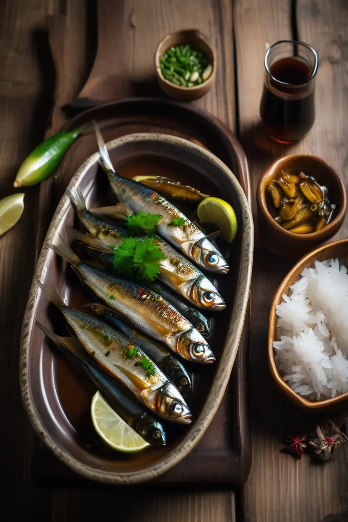 Crispy-skinned sardines infused with warm ginger, garlic, and citrus, roasted until golden and served with a vibrant ginger-soy glaze that brings out their delicate, briny flavor.