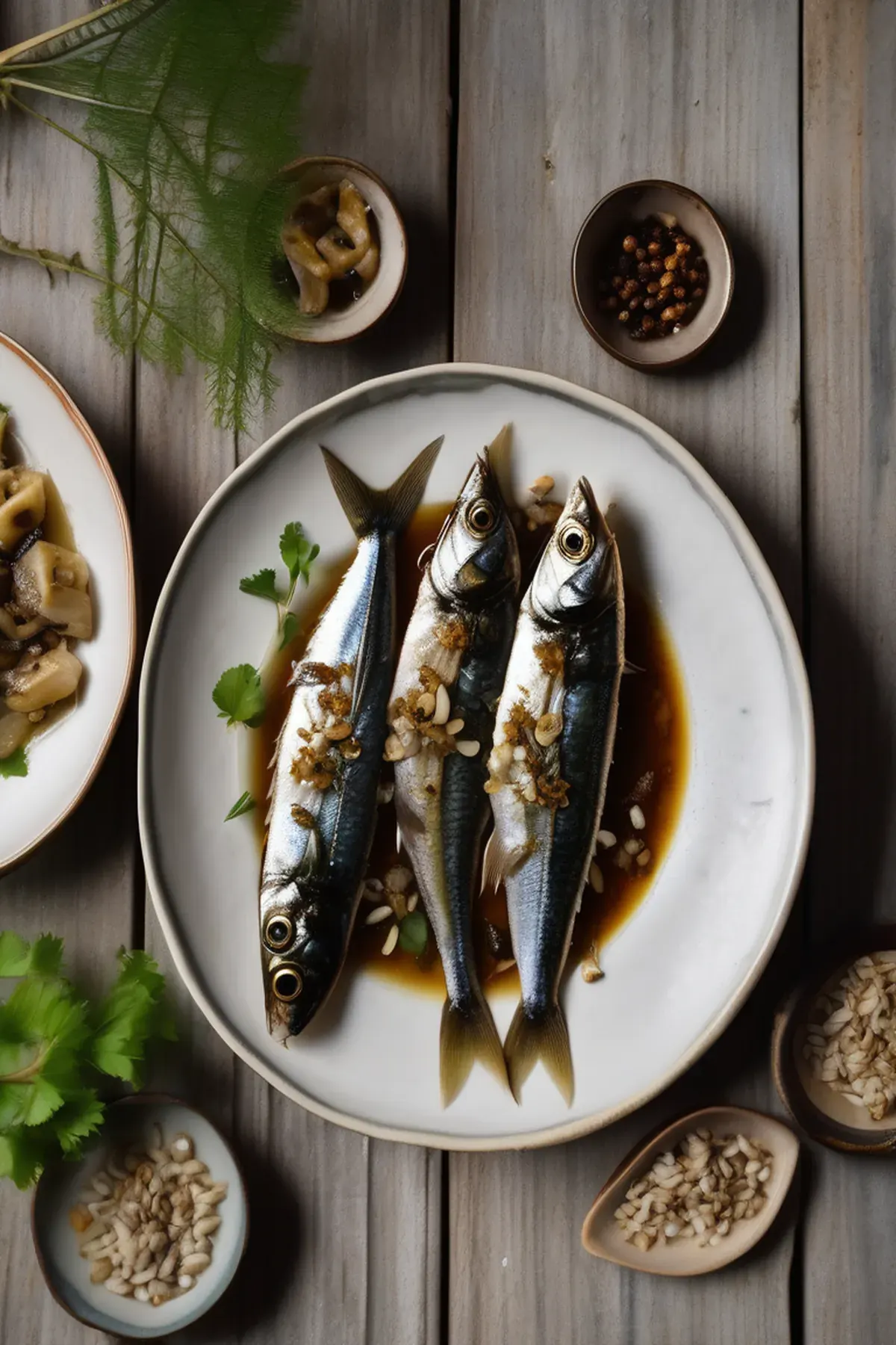 Roasted Sardines with Lotus Root and Crispy Garlic
