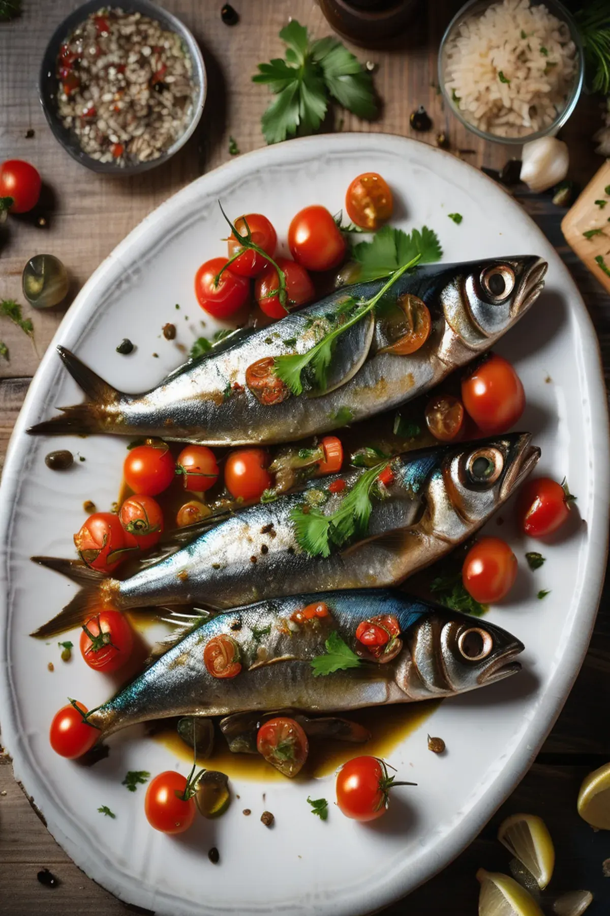 Fresh sardines roasted until crispy and tender, topped with a fragrant tomato compote infused with garlic, olive oil, and fresh herbs. A Mediterranean classic that's simple, elegant, and bursting with flavor.