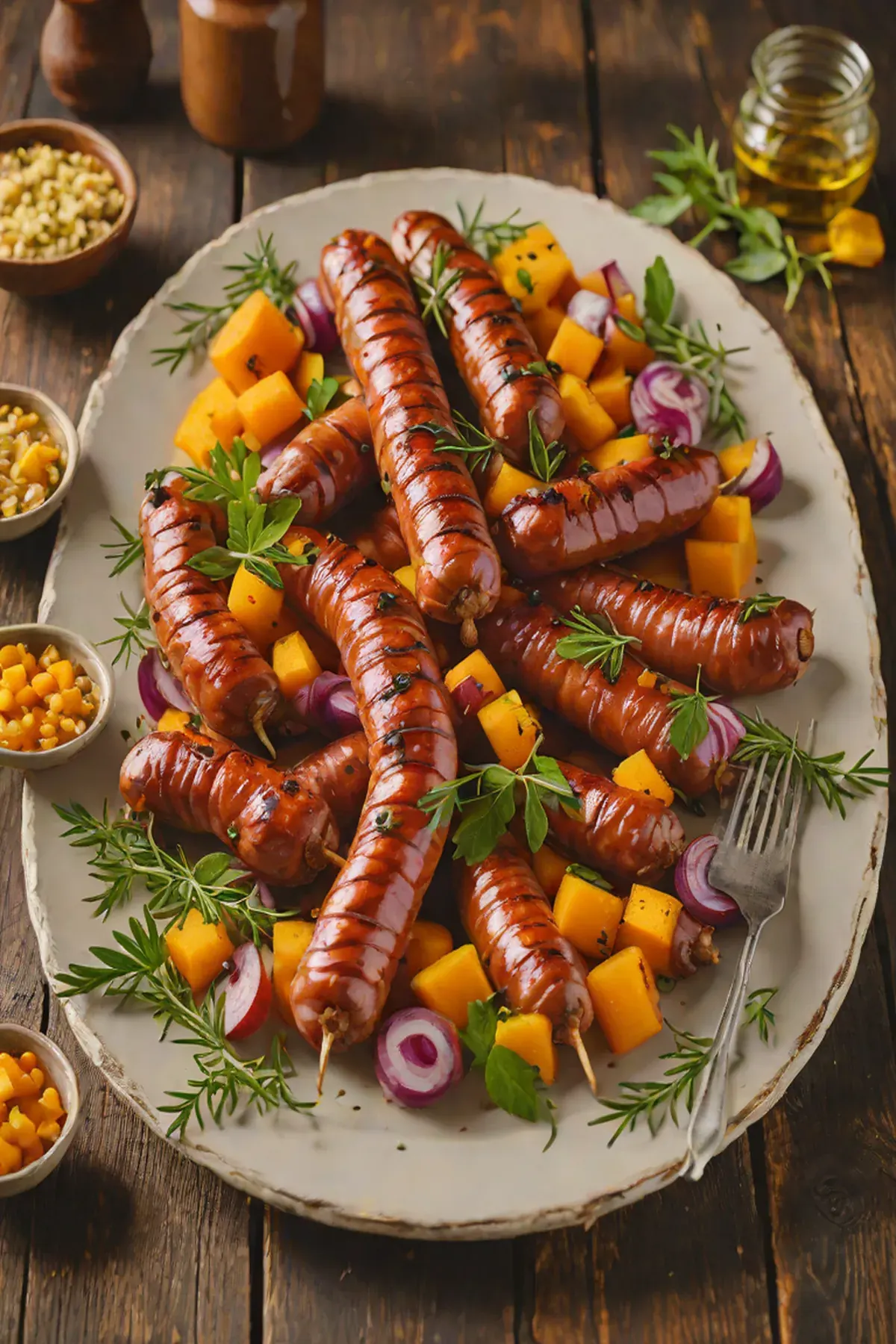 Roast in the preheated oven for 30-35 minutes, stirring the vegetables and turning the sausages halfway through cooking, until the squash is fork-tender and the sausages are cooked through with golden-brown skin.