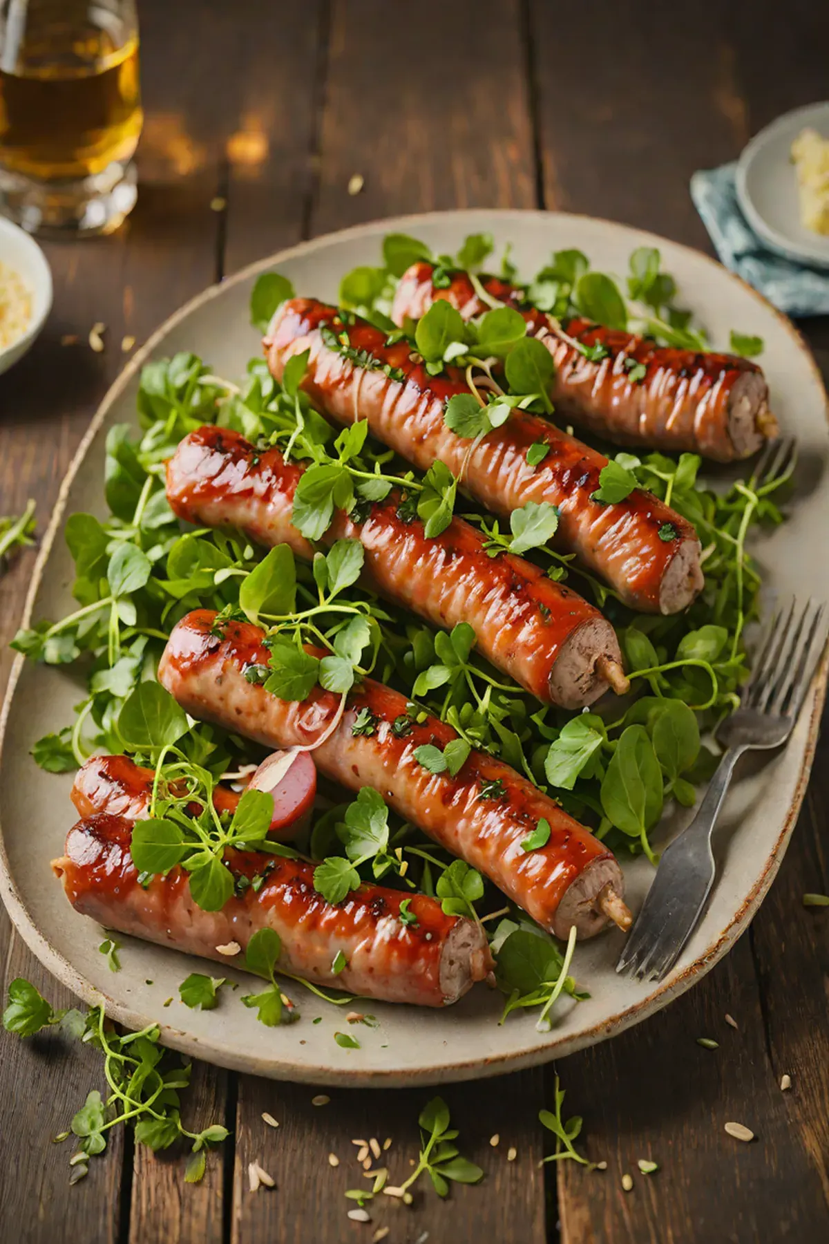 Arrange the roasted sausages over the watercress. Drizzle the lemon-garlic dressing over everything and top with remaining caramelized shallots.