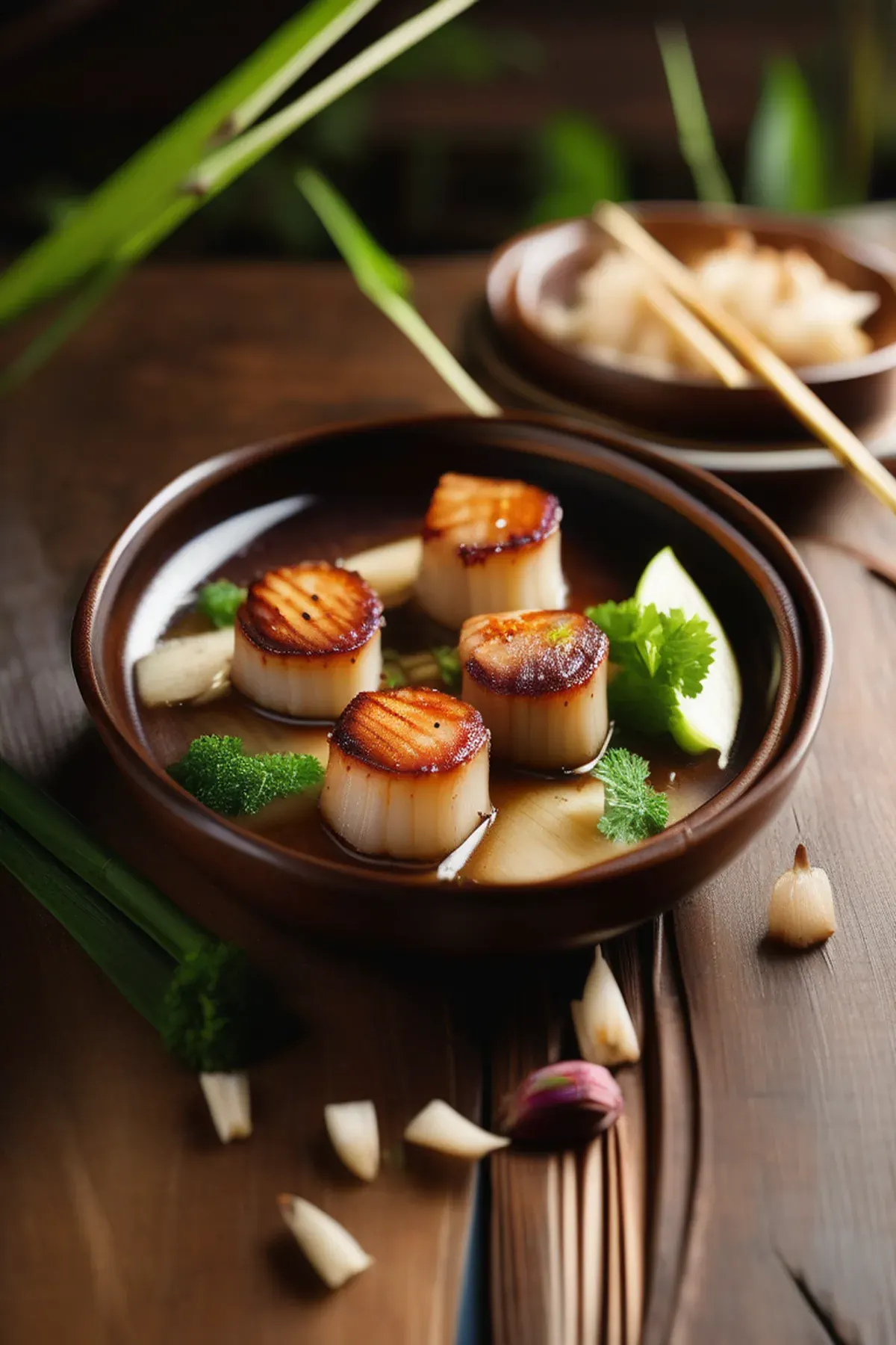 Succulent pan-seared scallops paired with tender roasted bamboo shoots in a delicate garlic and white wine reduction, finished with fresh herbs and a hint of lemon for a restaurant-quality seafood dish.