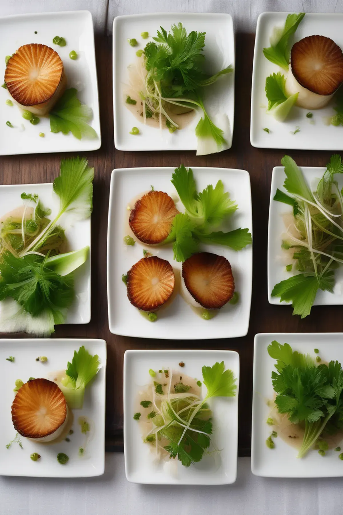 Succulent pan-seared scallops served over a silky celery root puree, topped with caramelized celery and fresh celery leaf oil. A refined yet simple dish that lets the sweet brininess of the scallops shine.