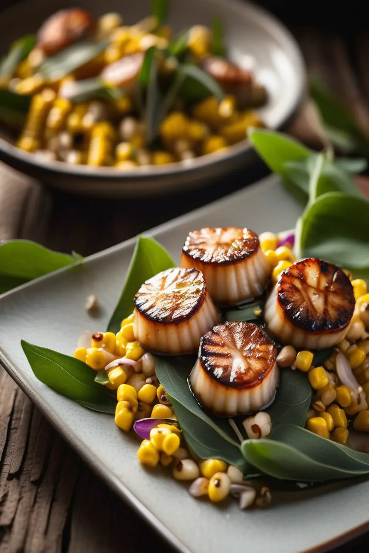 Succulent sea scallops paired with sweet roasted corn kernels, finished with nutty brown butter and crispy sage leaves for an elegant yet simple coastal-inspired dish.