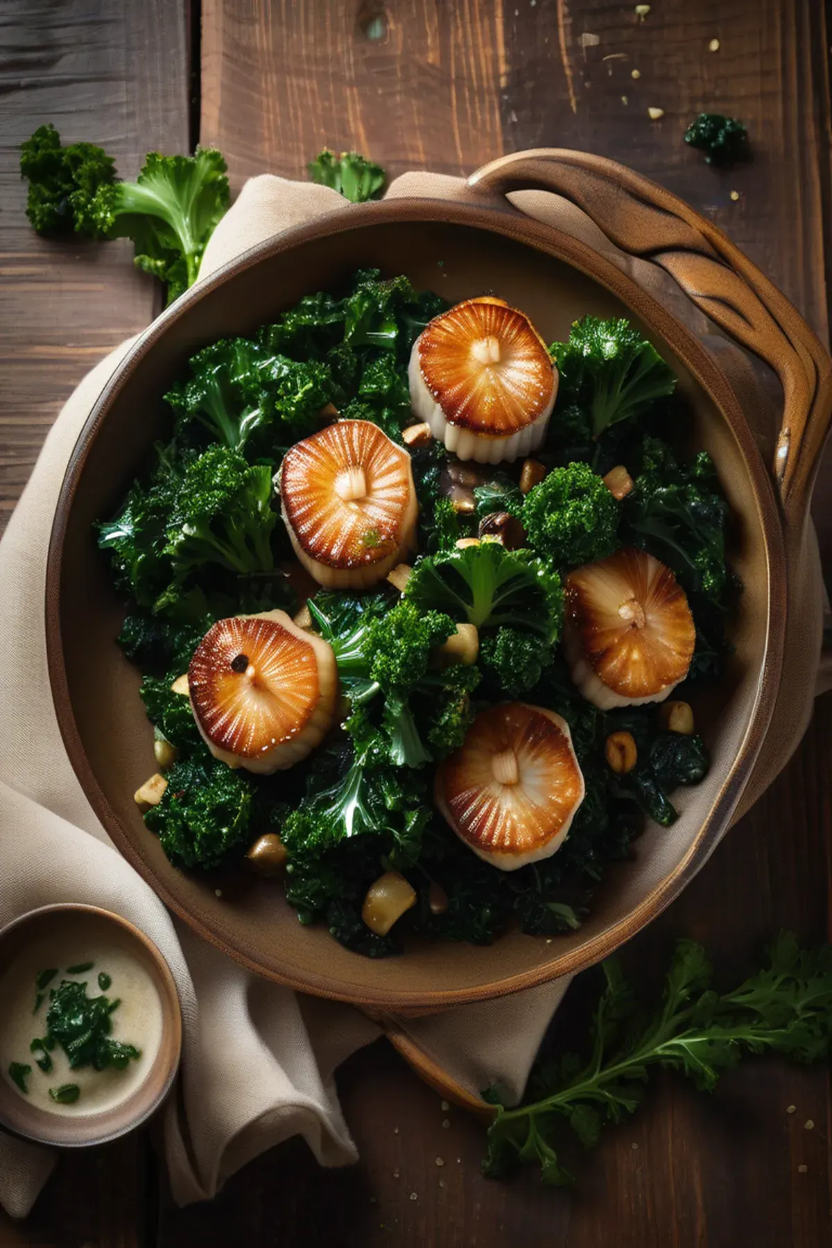 Succulent sea scallops with a golden crust paired with crispy garlic-infused kale and a bright lemon-butter sauce. This elegant yet simple dish comes together in minutes for an impressive dinner.