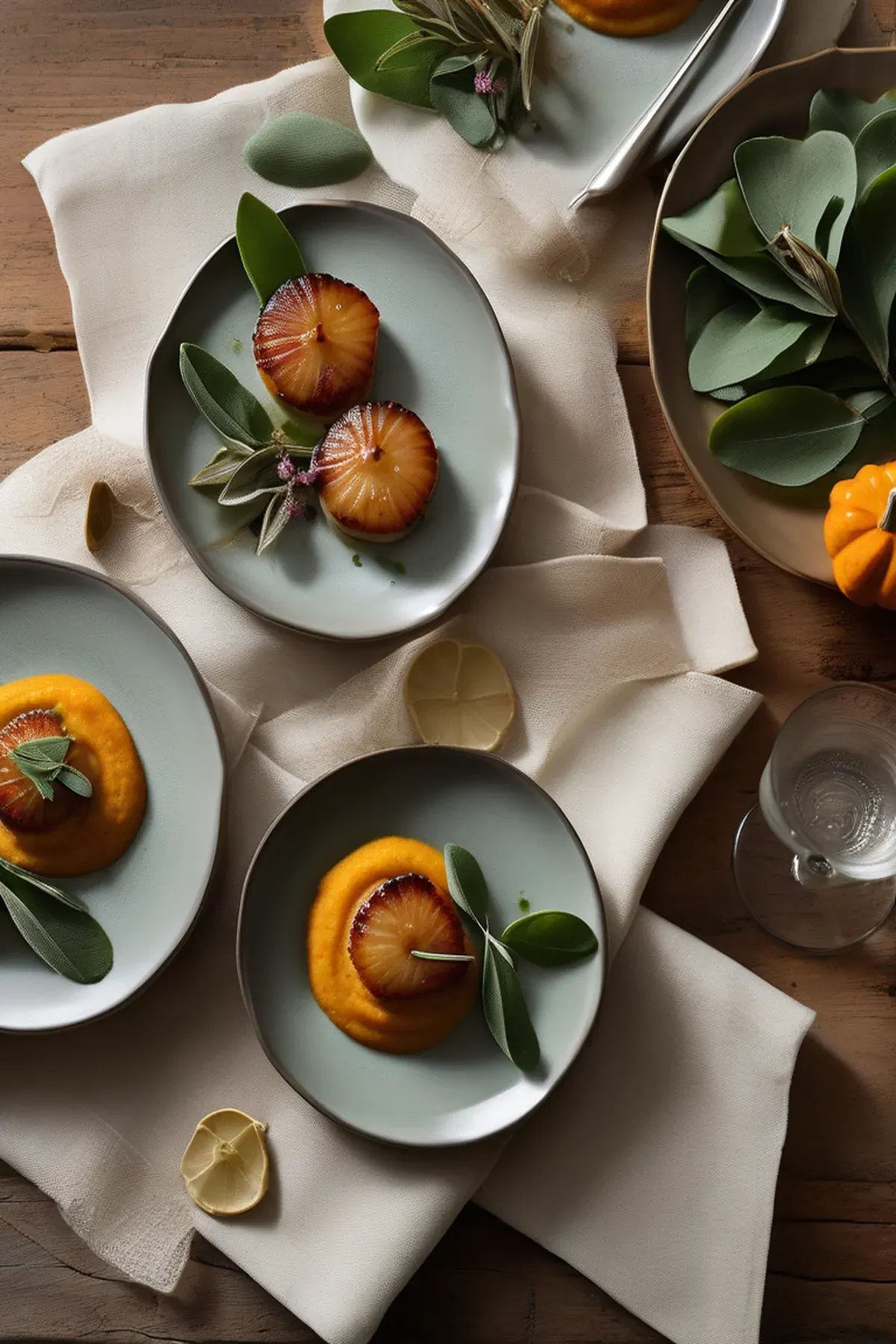 Succulent sea scallops with a golden crust paired with silky pumpkin puree, finished with crispy sage and nutty brown butter for an elegant autumn-inspired dish.