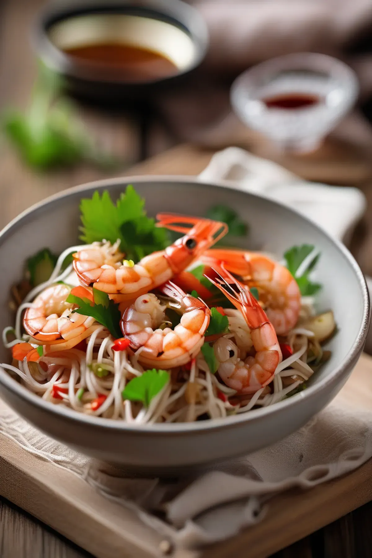 Succulent roasted shrimp tossed with crispy bean sprouts in a savory garlic-ginger sauce, finished with a touch of sesame oil and fresh cilantro for a light yet satisfying dish.