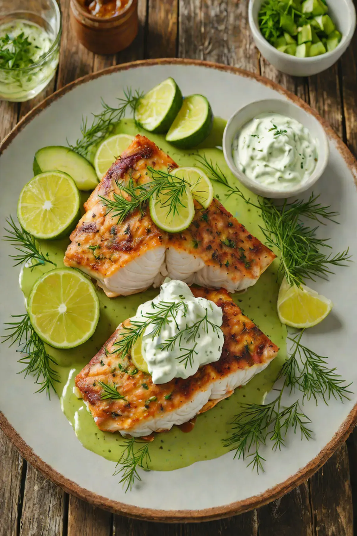 Drizzle the dill cream sauce around the fish and cucumber, then garnish each plate with a sprinkle of capers and an extra small dill leaf if desired.