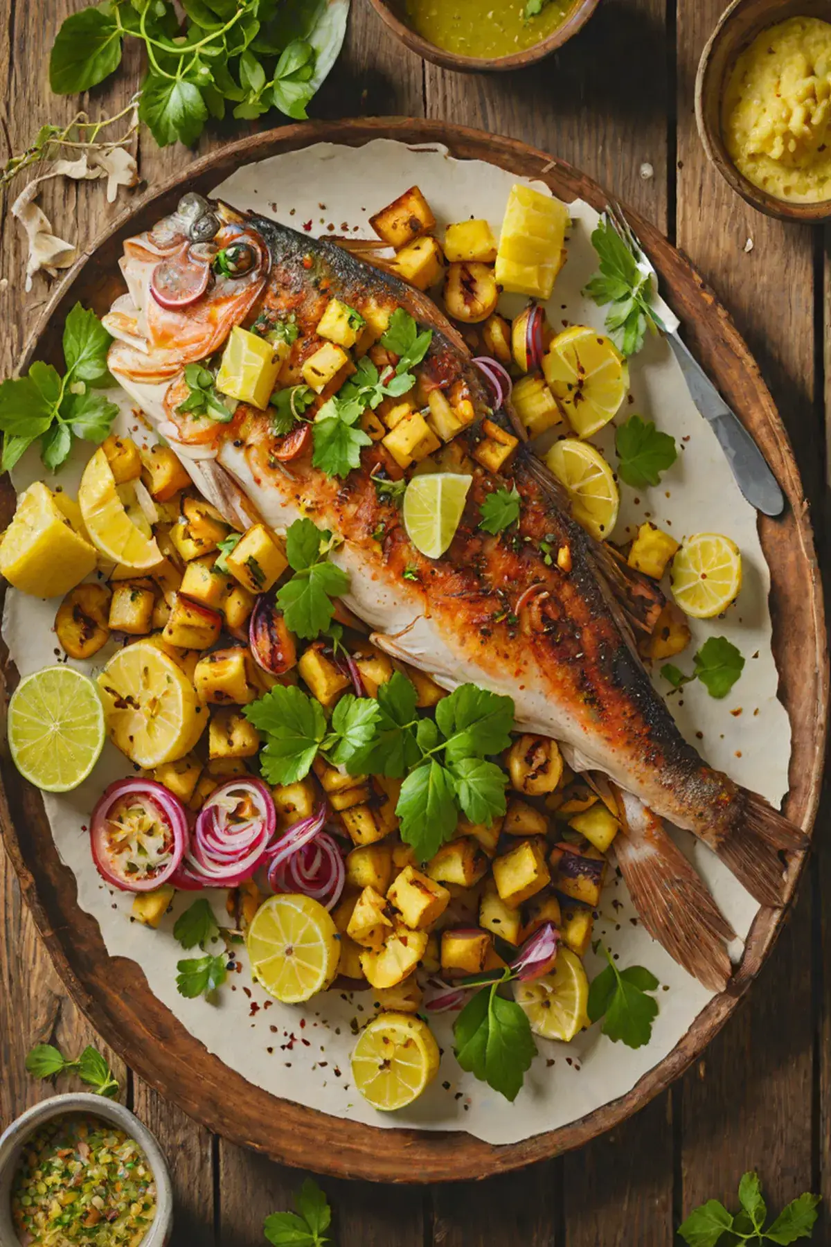 Arrange the roasted plantain wedges on serving plates and top each with a snapper fillet. Scatter the thinly sliced red onion over the top.