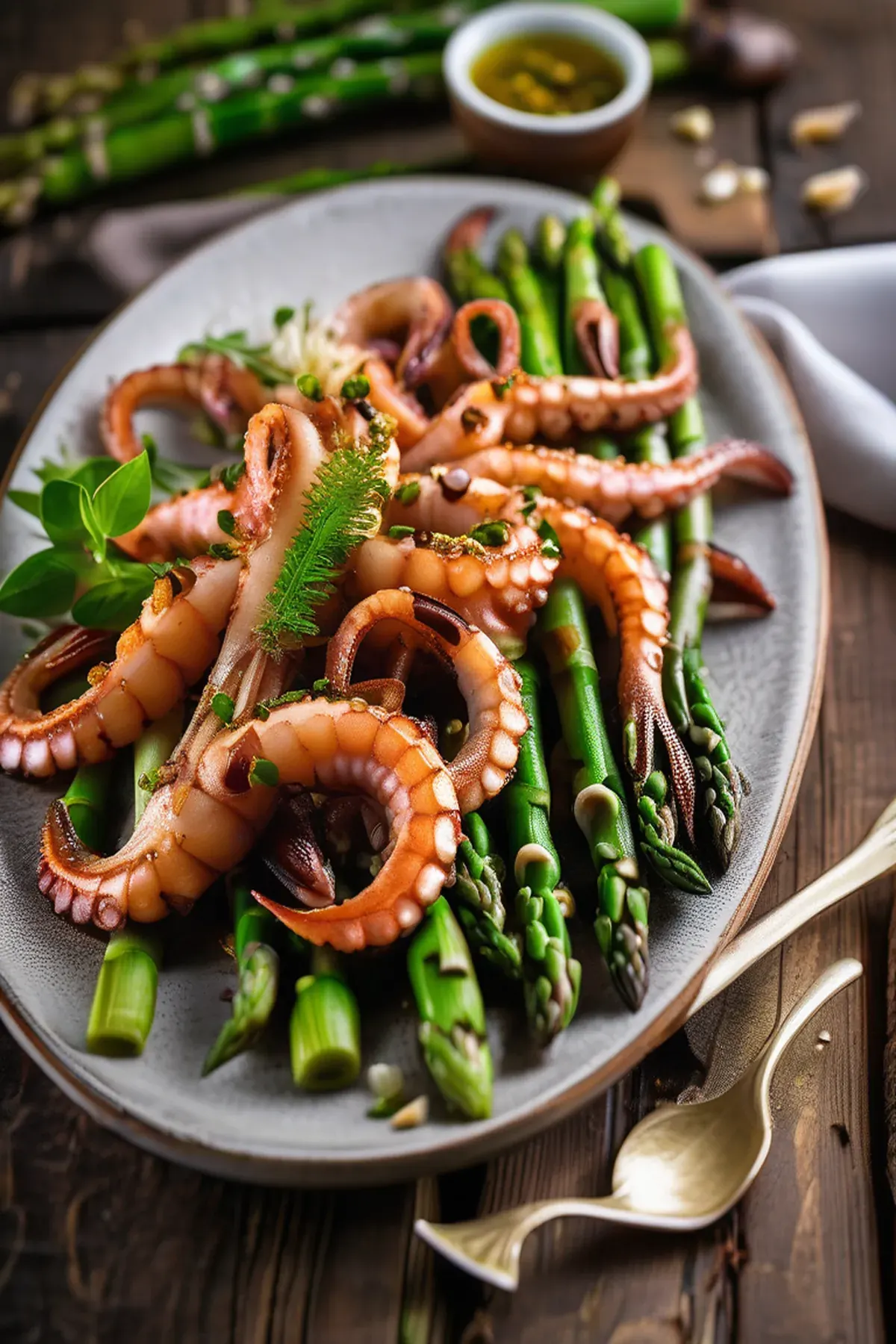 Tender roasted squid paired with crispy asparagus spears, finished with garlic, lemon, and a touch of chili for a restaurant-quality Mediterranean dish.