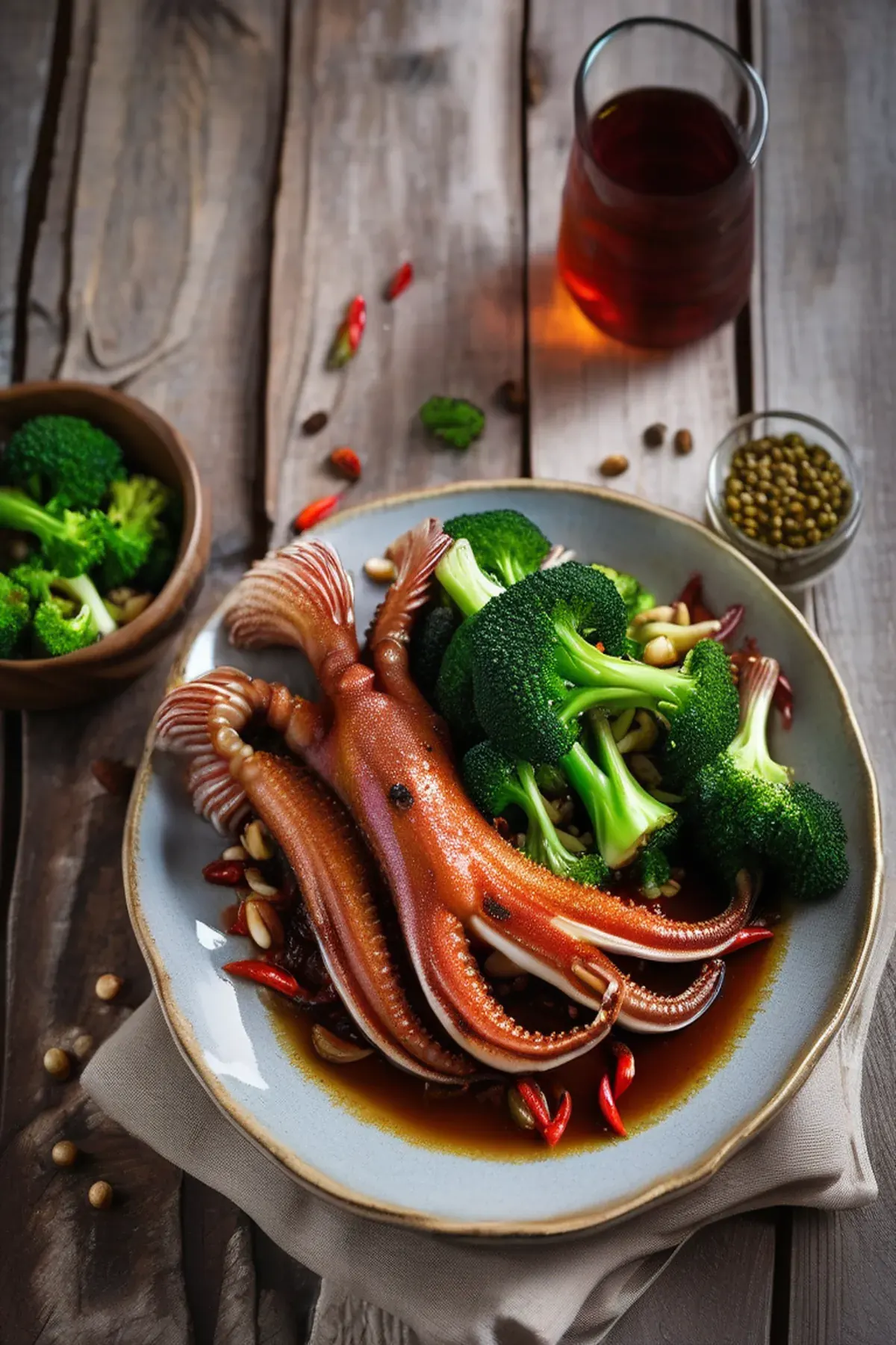 Tender roasted squid tubes with crispy garlic-infused broccoli florets, finished with a bright lemon and chili oil drizzle for a Mediterranean-inspired seafood sensation.