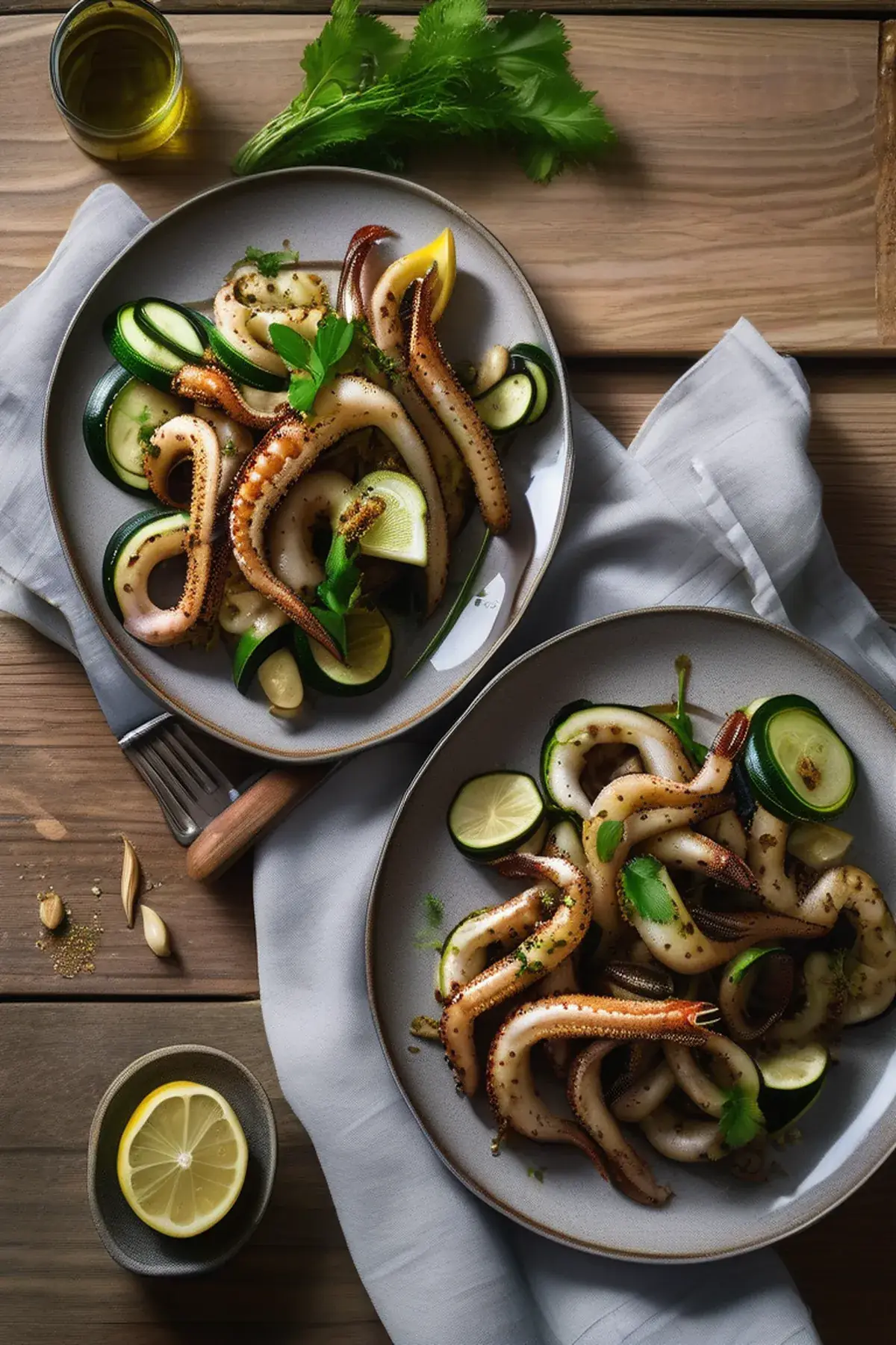 Tender roasted squid paired with caramelized courgette, garlic, and fresh herbs creates a Mediterranean-inspired dish that's elegant yet simple to prepare.