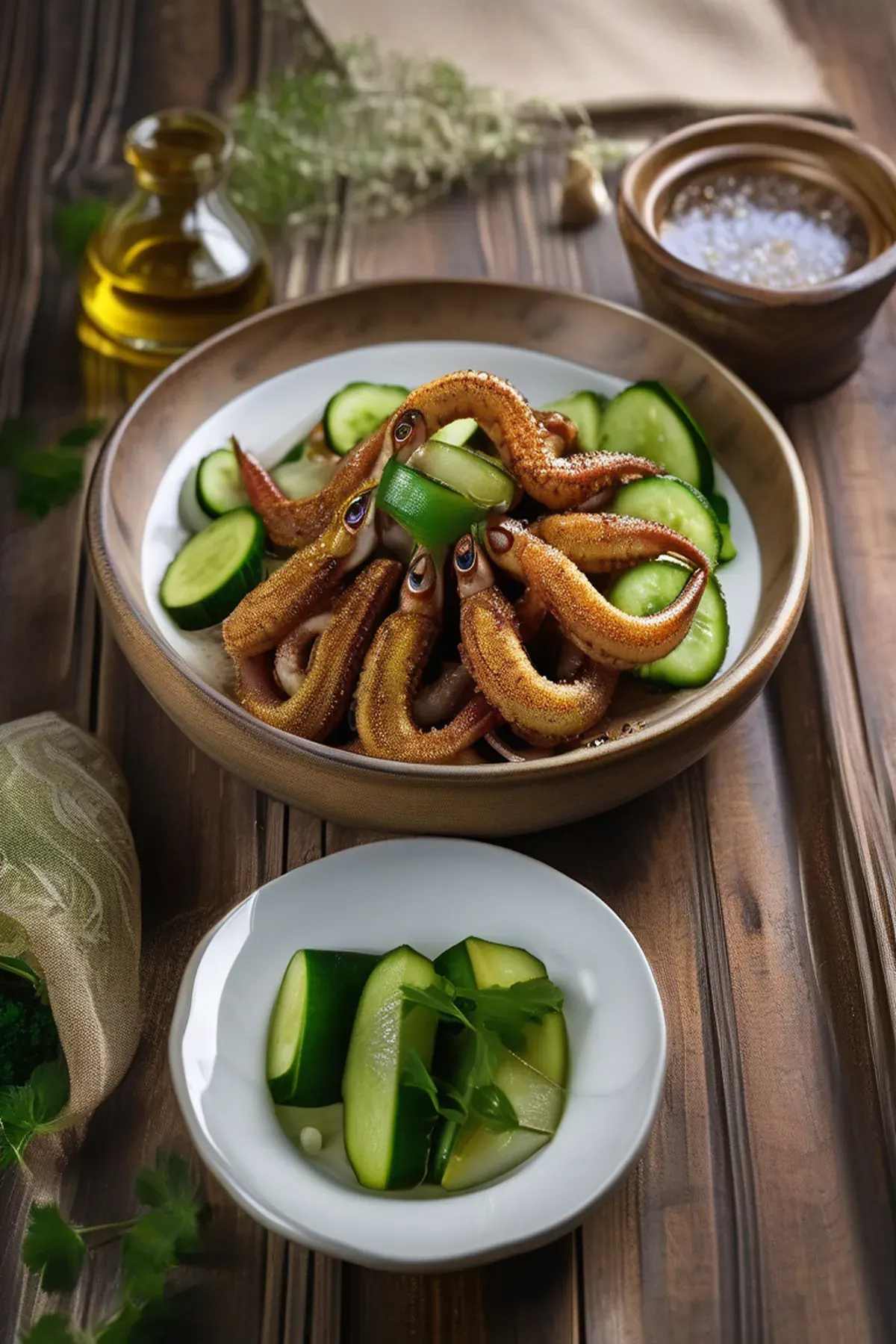 Tender roasted squid with a crispy exterior paired with refreshing cucumber ribbons, finished with a bright lemon-herb vinaigrette for a light and elegant Mediterranean-inspired dish.