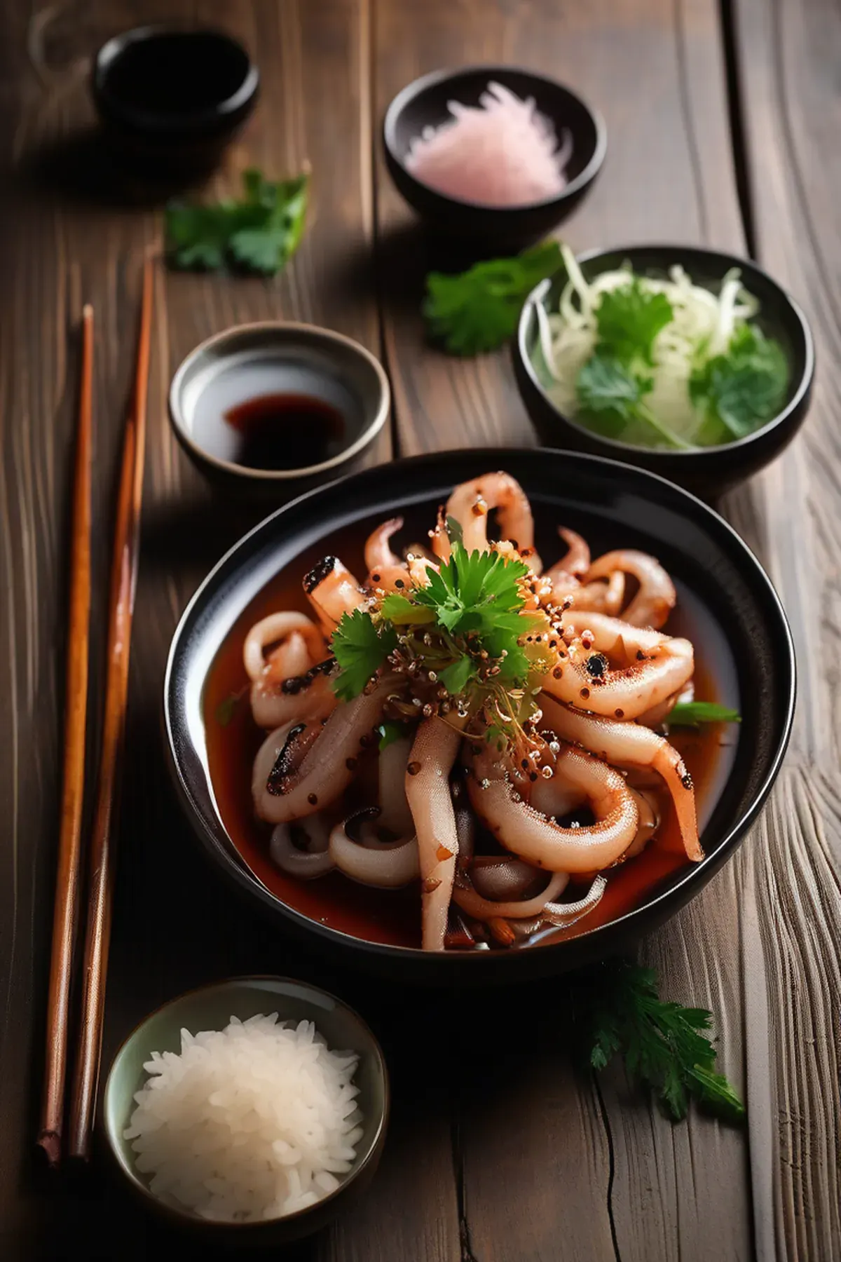 Tender roasted squid paired with sweet caramelized daikon radish, finished with a savory soy-ginger glaze and toasted sesame seeds for a sophisticated yet simple Asian-inspired dish.