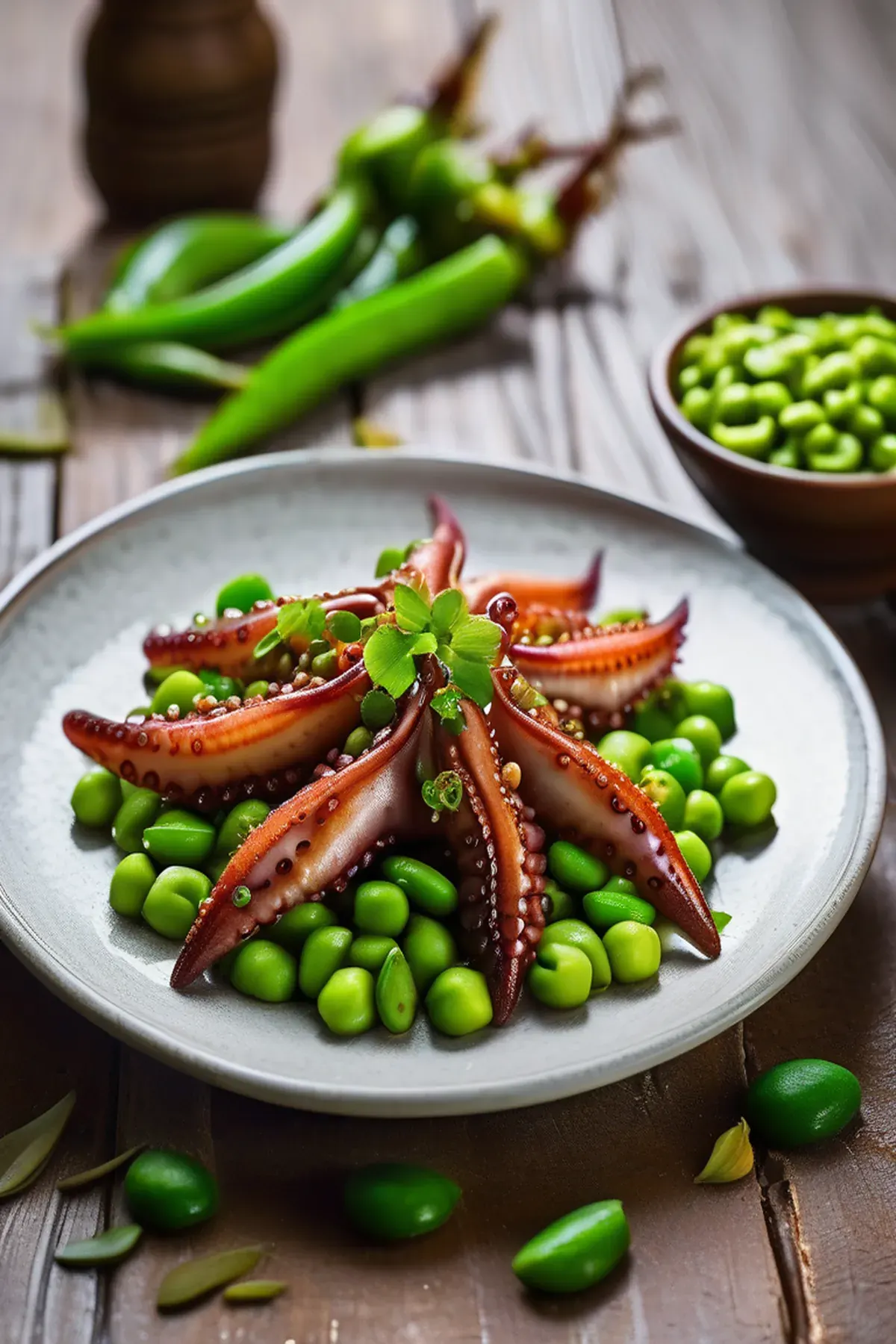 Tender roasted squid paired with buttery edamame, finished with a bright lemon-garlic glaze and fresh herbs for a simple yet elegant Mediterranean-inspired dish.