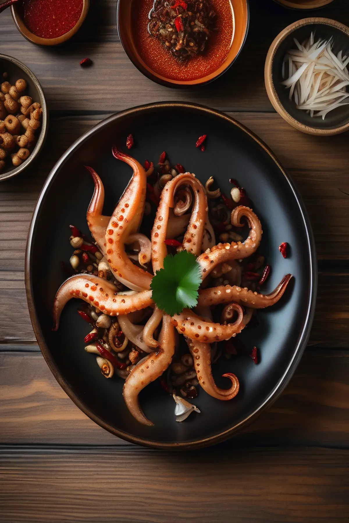 Tender roasted squid paired with crispy-edged lotus root slices, finished with a garlic-chili oil and fresh herbs for a elegant yet simple seafood dish.