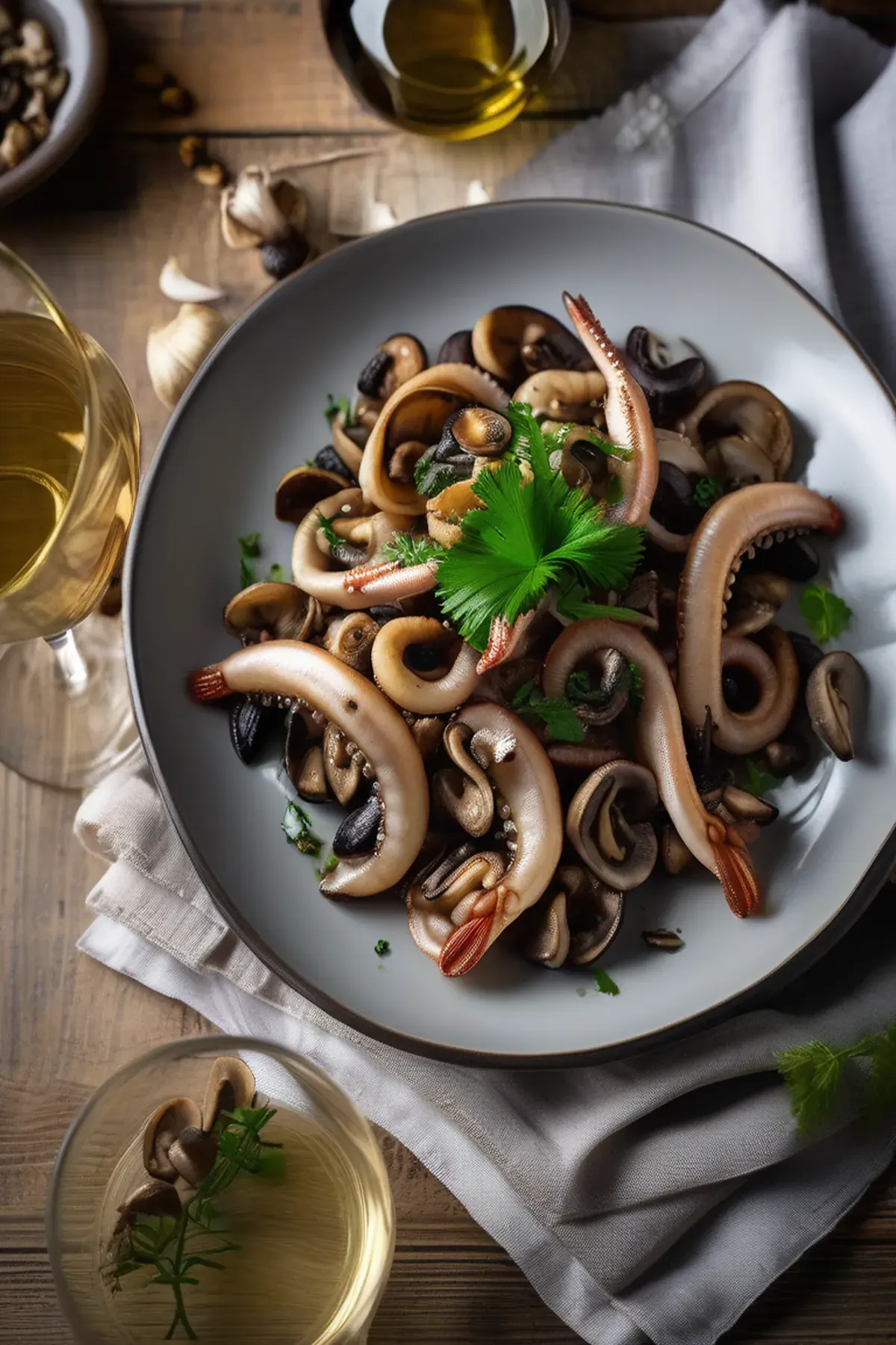 Tender roasted squid paired with earthy mushrooms in a fragrant garlic butter sauce, finished with fresh herbs and a hint of lemon for a restaurant-quality seafood dish.