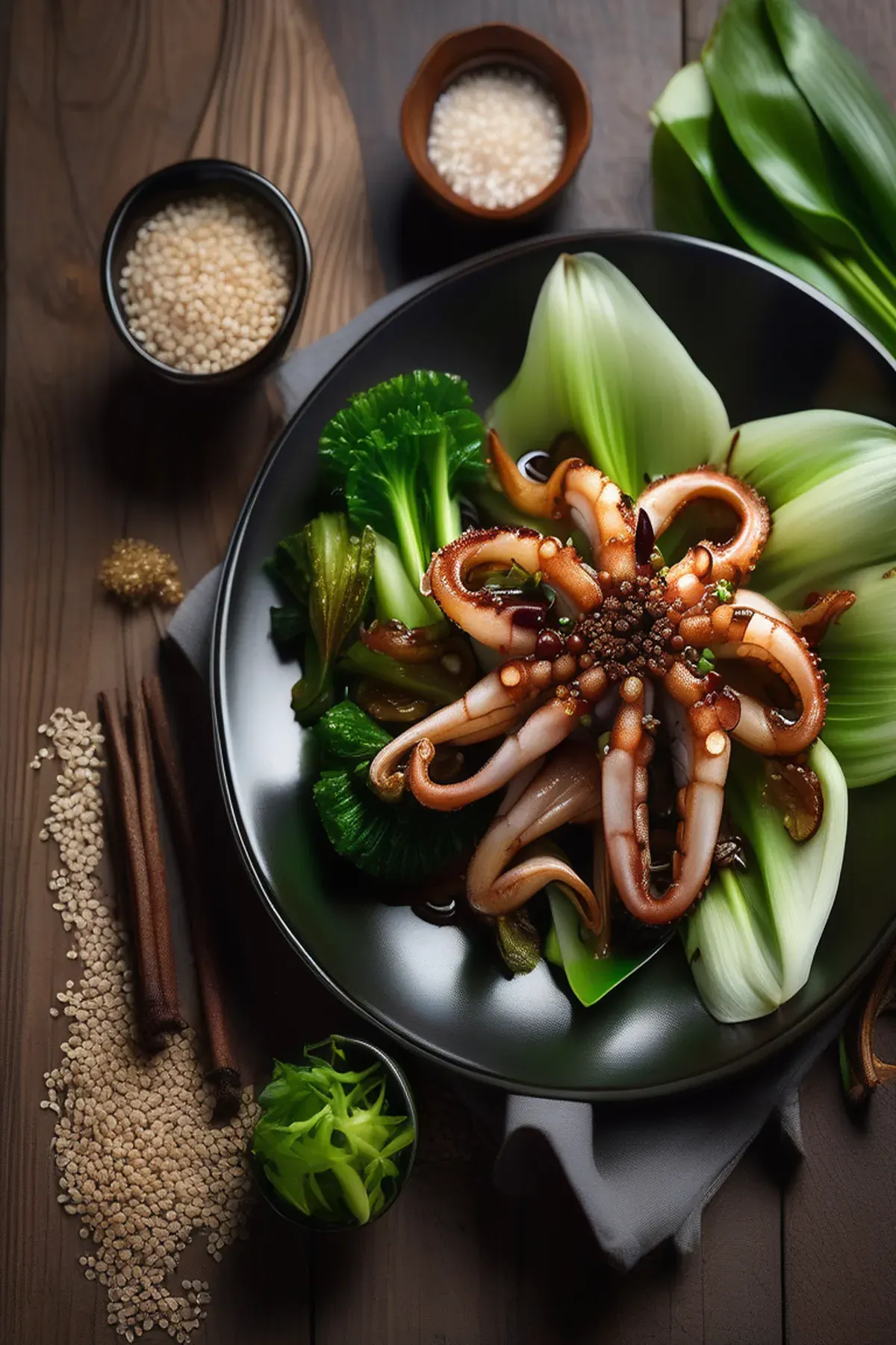 Tender roasted squid with a golden, slightly crispy exterior paired with silky pak choi in a fragrant garlic and ginger sauce. A restaurant-quality dish that's surprisingly simple to prepare at home.