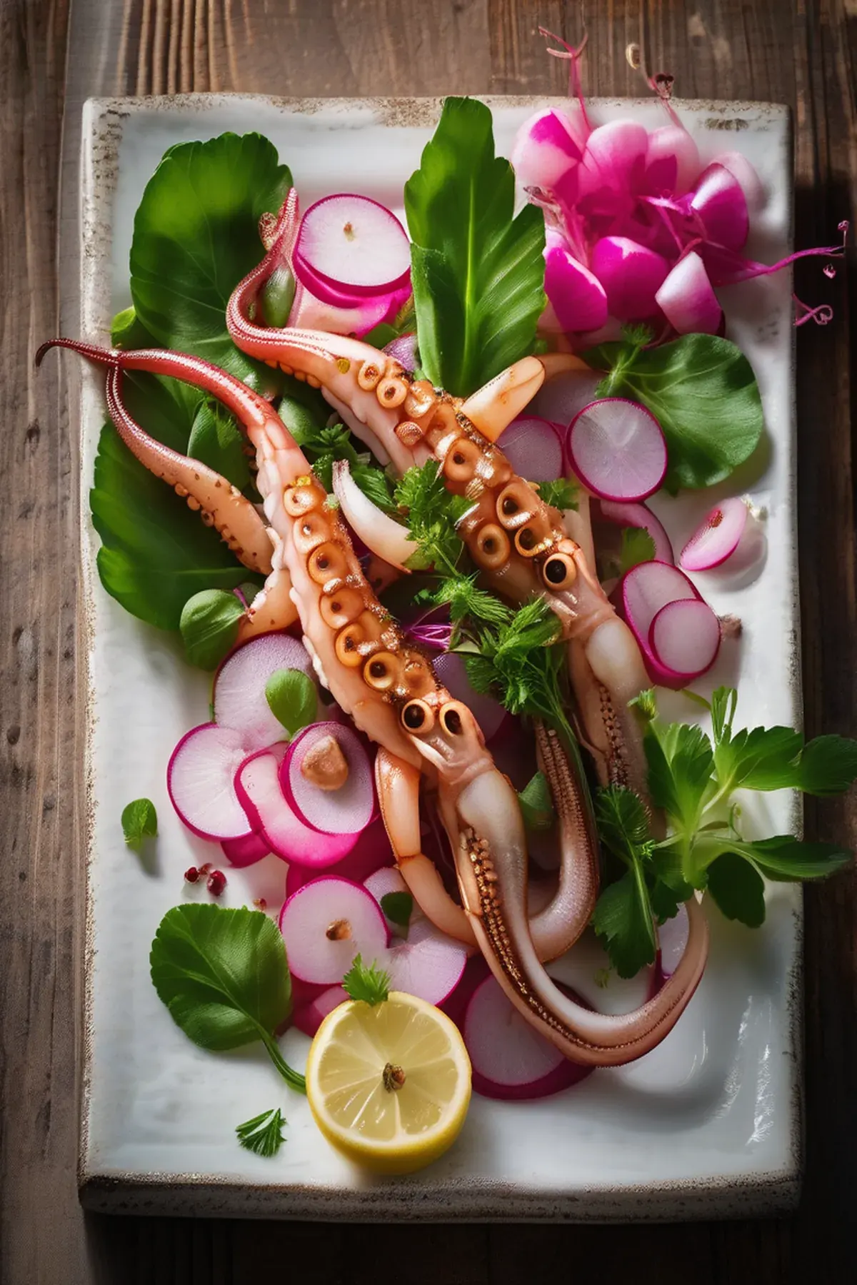 Tender roasted squid paired with crispy roasted radishes creates a delightful Mediterranean-inspired dish with a perfect balance of umami and peppery sweetness.