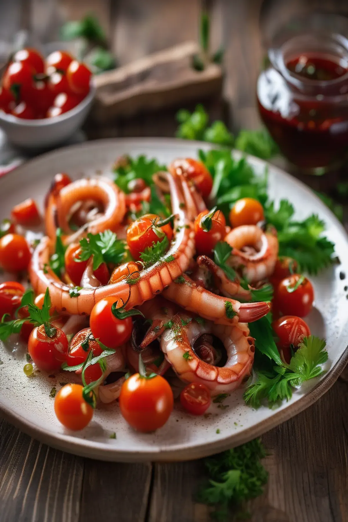 Tender roasted squid tossed with sweet cherry tomatoes, garlic, and fresh herbs, creating a Mediterranean-inspired dish that's elegant yet simple to prepare.