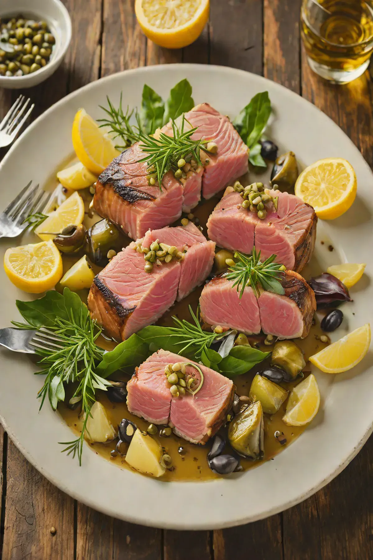 Return the roasted artichokes to the skillet and gently toss to coat with the sauce. Add the cooked tuna steaks back to the pan or arrange them on serving plates with the artichoke mixture alongside.