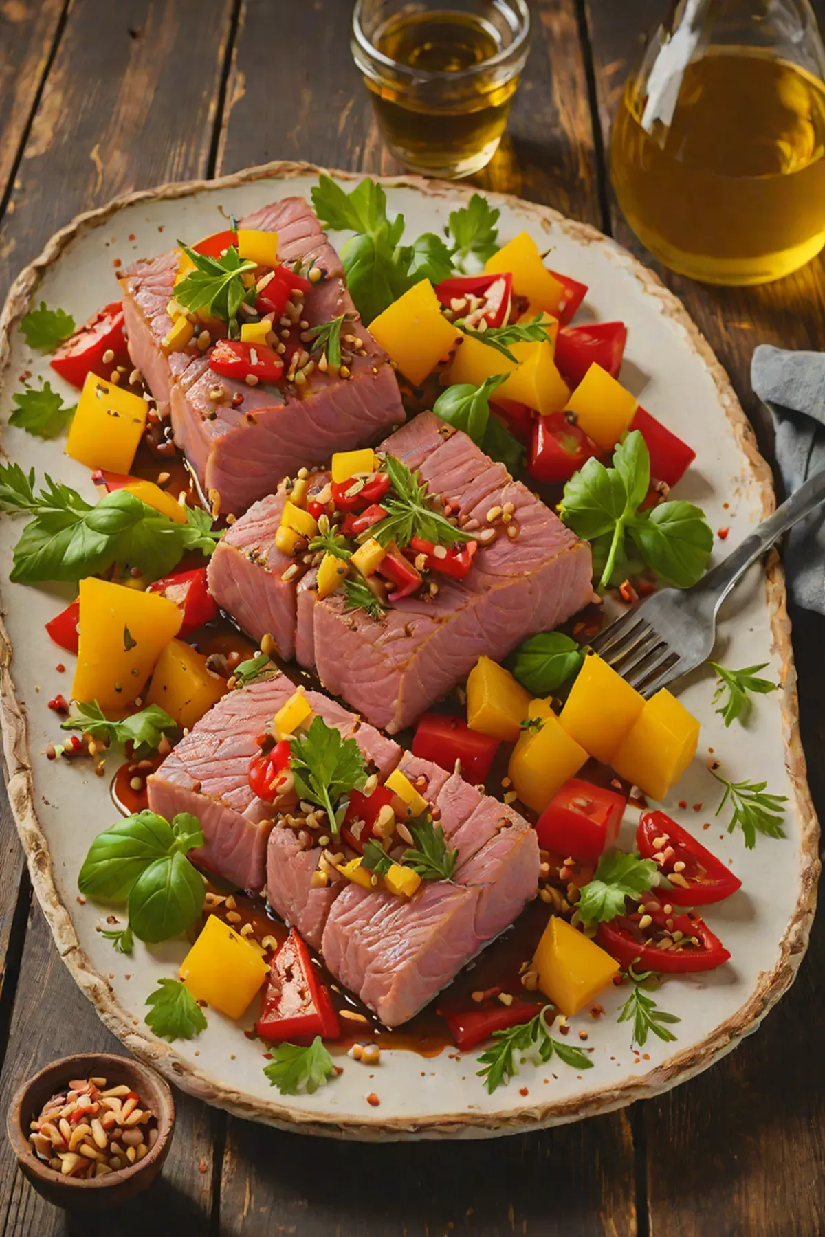 Here's a recipe I've been making all summer that never fails to impress. Roasted tuna with bell peppers is one of those dishes that looks fancy but honestly comes together in less than an hour. The tuna is packed with omega 3 fatty acids that are wonderful for your heart, and the colorful peppers add natural sweetness without any fuss. What I love most is that it's straightforward enough for a weeknight dinner yet elegant enough to serve guests. Just throw everything on a pan, roast it, and you've got restaurant quality food at home without breaking the bank.