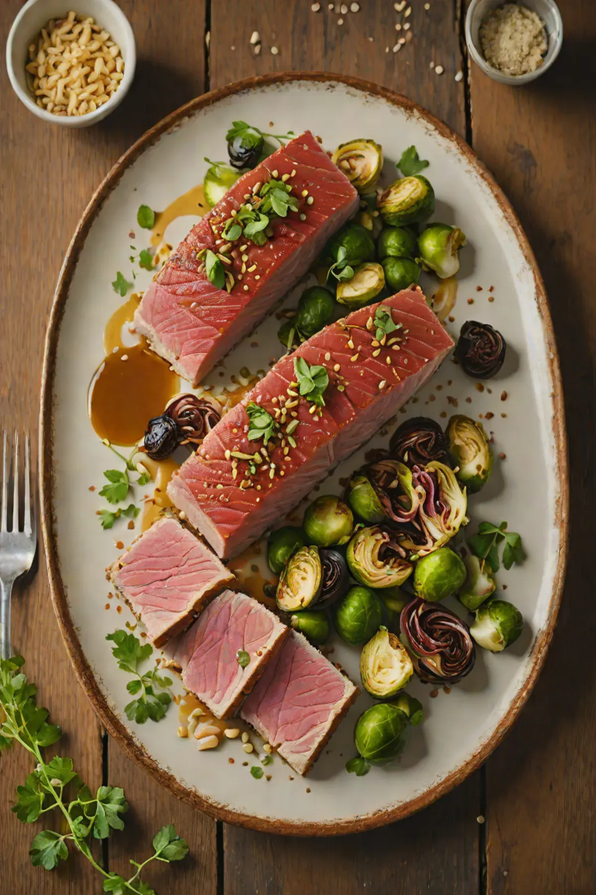 Plate the tuna steaks alongside the Brussels sprouts, garnish with sesame seeds and any remaining miso butter, and serve immediately.