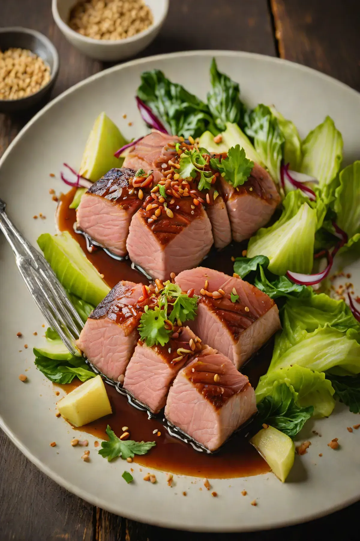 Flip the pak choi and cook for another 1-2 minutes until tender-crisp. Drizzle the prepared glaze over the pak choi, then nestle the seared tuna steaks back into the skillet.