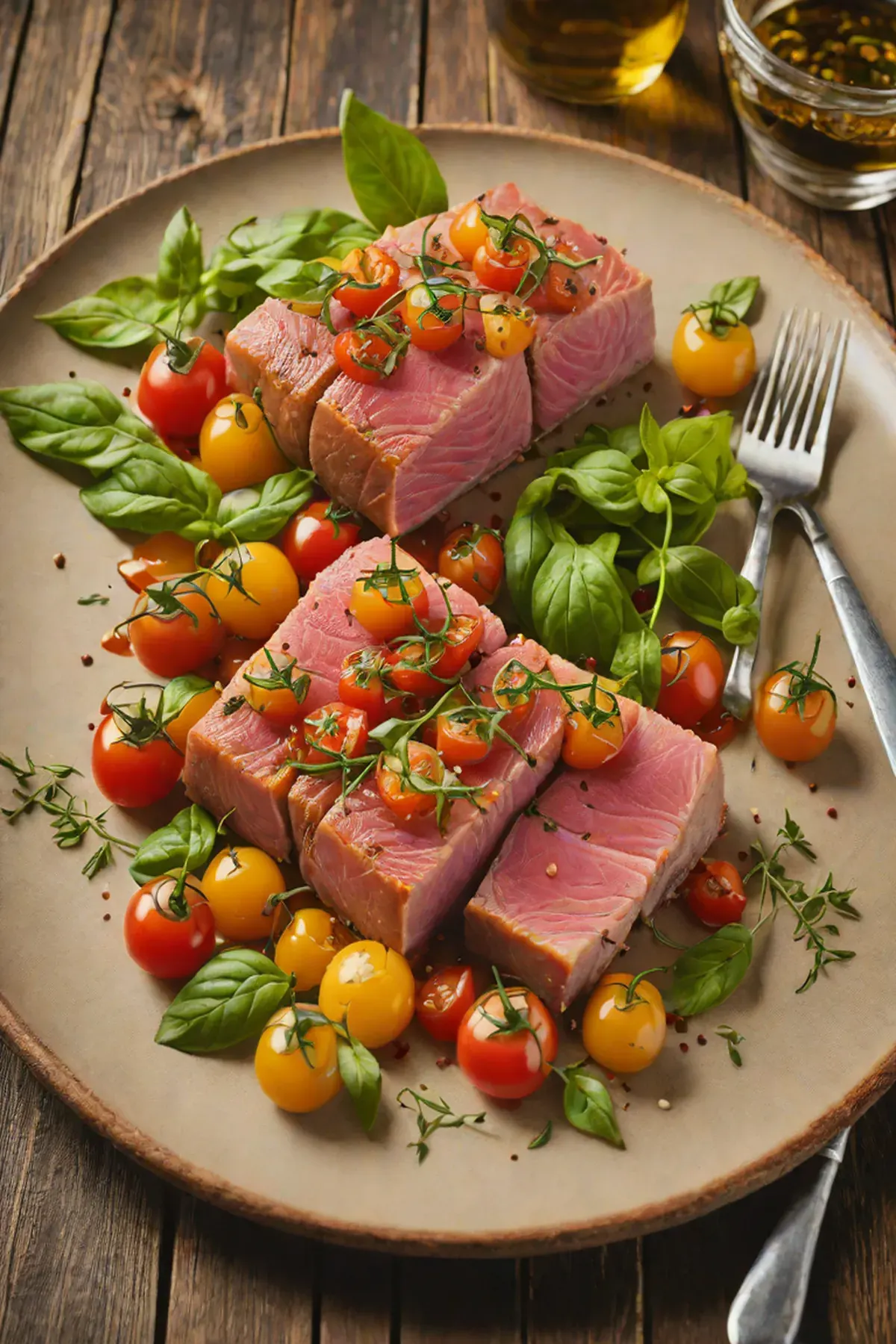 This is one of my favorite weeknight dinners because it comes together in just 35 minutes with minimal fuss. Fresh ahi tuna is packed with omega 3 fatty acids that are wonderful for heart health, and when you pair it with roasted cherry tomatoes and aromatic garlic, you get a restaurant quality meal that tastes far more complicated than it actually is. The best part is how forgiving this recipe is, letting you work with whatever fresh herbs and quality olive oil you have on hand. It's elegant enough for guests but simple enough for a regular Tuesday night.