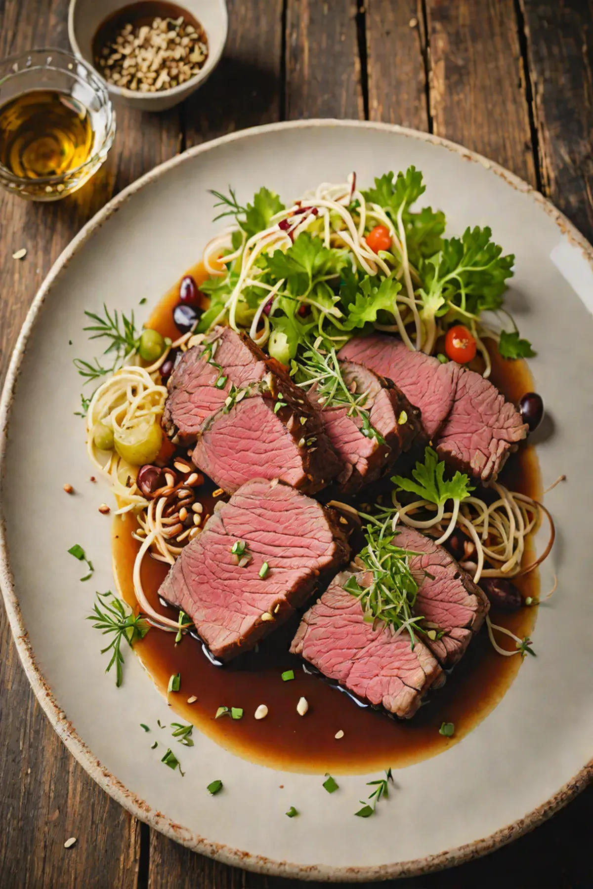 Slice rested venison loin against the grain into 0.5-inch thick pieces. Arrange venison on top of the bean sprout salad.