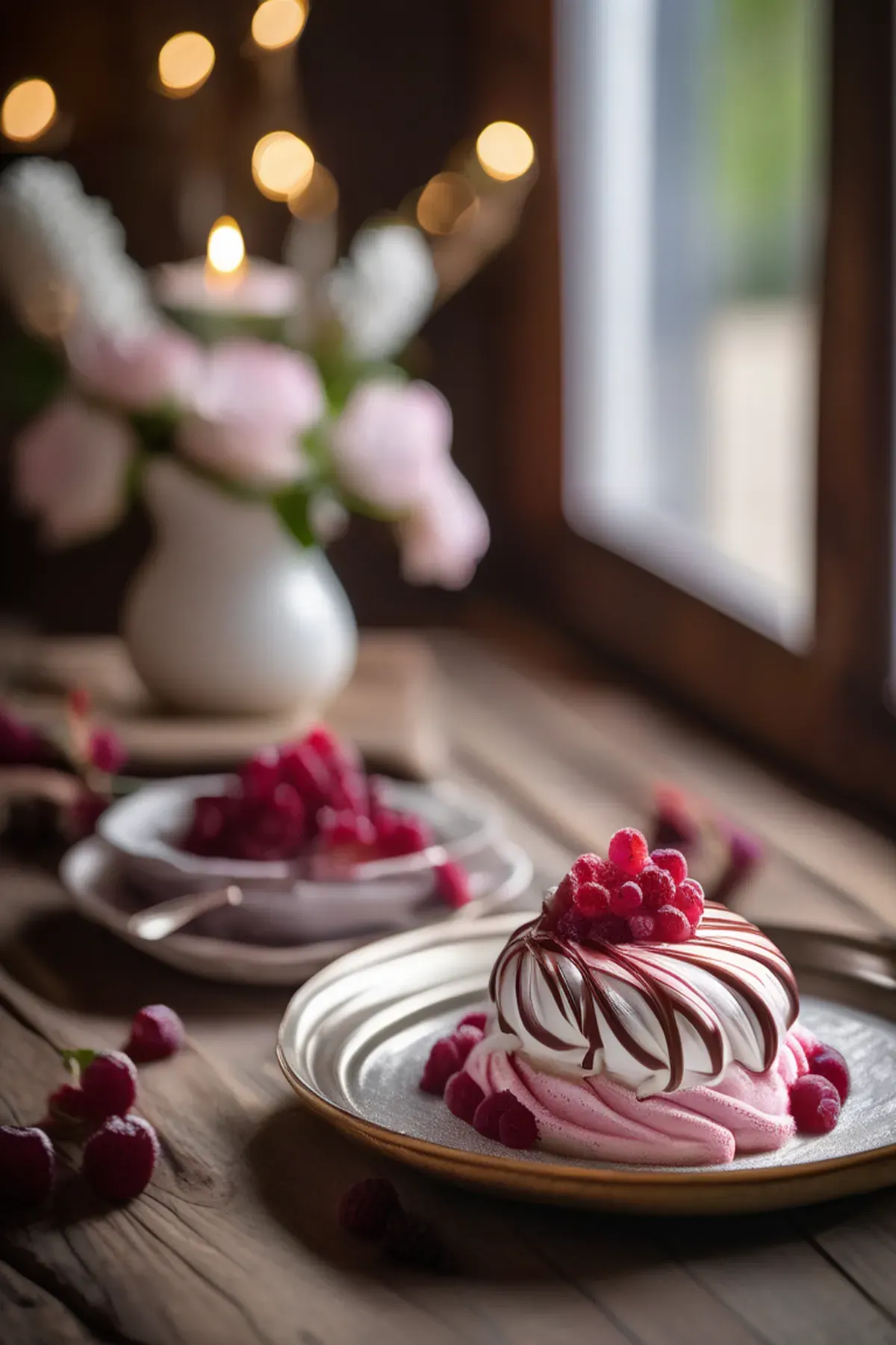 Assemble the baked Alaska by placing a scoop of ice cream in the bottom of each ramekin. Top with a layer of melted ruby chocolate, followed by a dollop of whipped cream. Sprinkle with confectioners' sugar and almond extract.